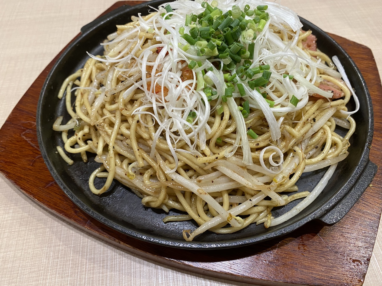 家内は塩焼きそば。麺はやや太め。もう少しアルデンテの方が好みです。白ネギがアクセントになって、味はおいしかったです。こちらを先に食べきったので、お好み焼きが食べきれませんでした。