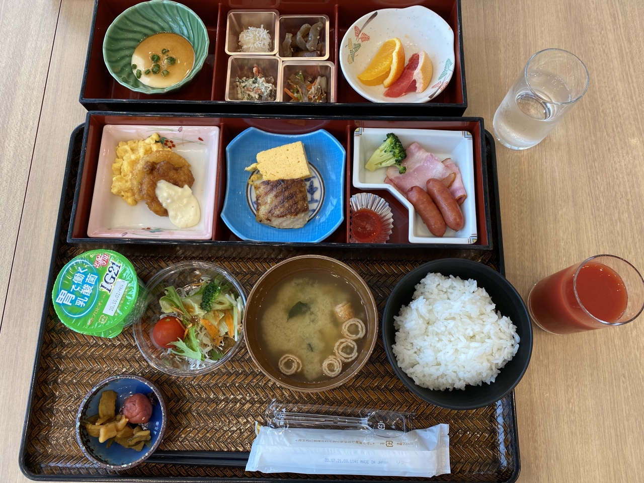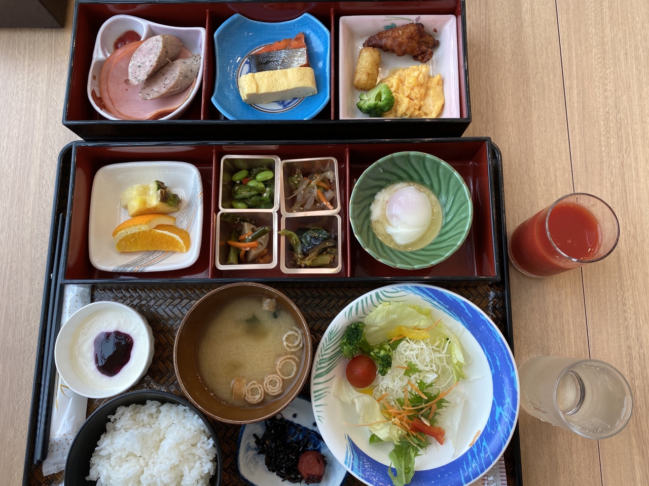 新型コロナの影響で、朝食は以前のようなブッフェ形式ではなく、二段弁当のような形でしたが、おかずの種類も結構あって満足でした。