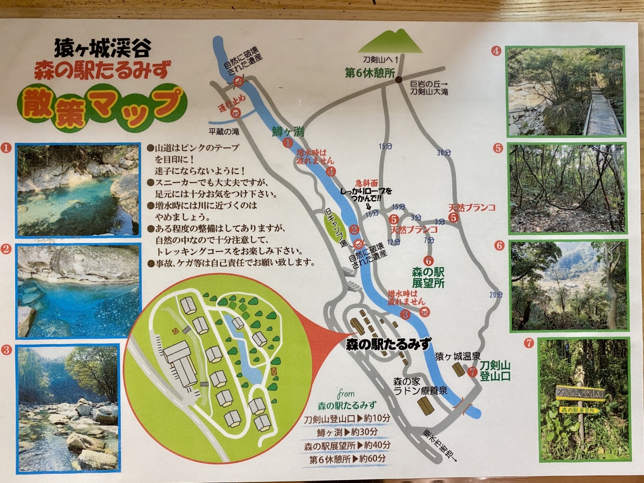猿ケ城渓谷の情報を得るために、まずは森の駅たるみずに入り、遊歩道のマップなどもらいましたが、吊り橋は水害の影響で崩壊していて渡れないとのこと