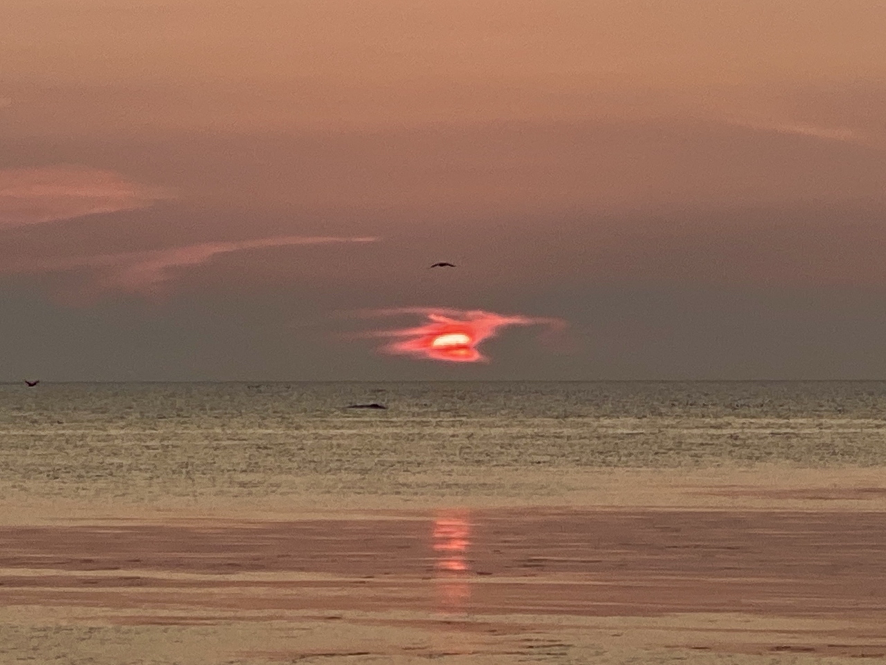浅瀬の所に太陽光が筋状に反射するので、太陽への階段のように見えました。空の夕焼けも綺麗でしたが、最後は地平線に雲があったので隠れてしまいました。風景を撮っていると海上に黒い物が浮いたり、沈んだりしていましたので、多分アザラシではないかと思います。鳥の集団も海面すれすれを物凄いスピードで移動していくのが見えて面白かったです。