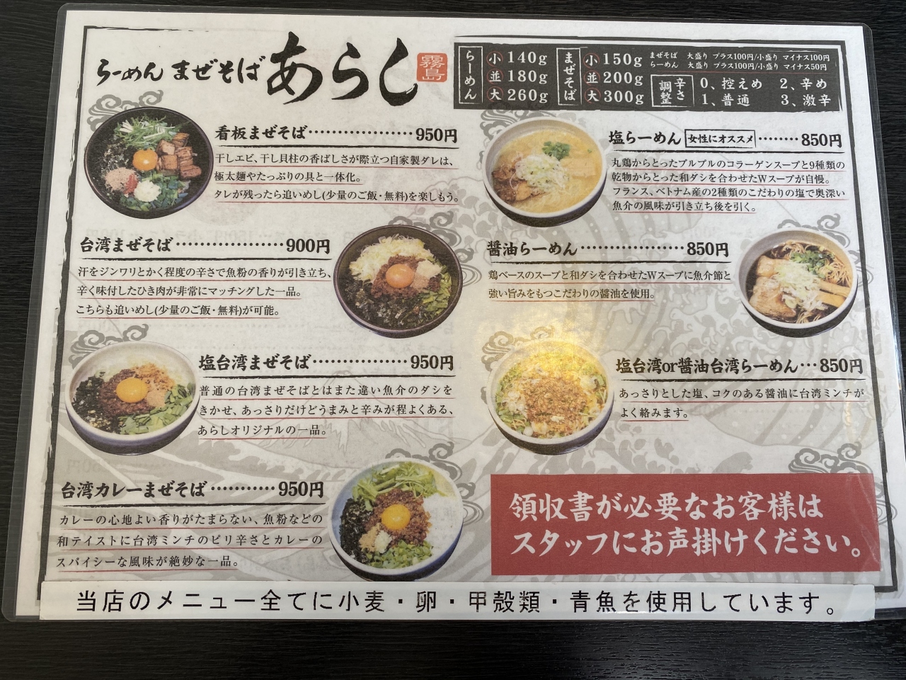 メインのまぜそばは、干しエビ、干し貝柱の和風タレの看板まぜそばと、台湾まぜそば、塩台湾まぜそば、台湾カレーまぜそばの4種類。