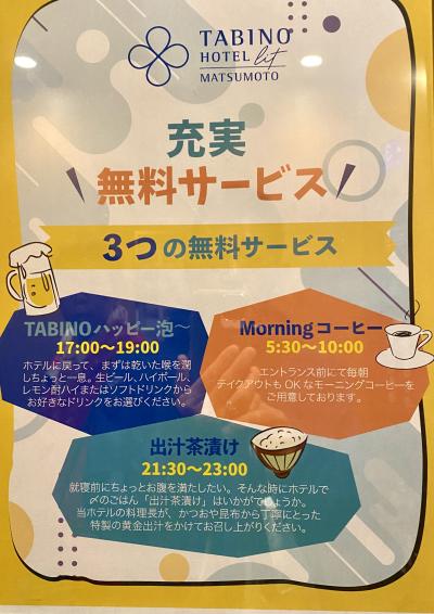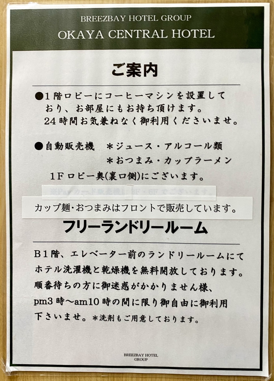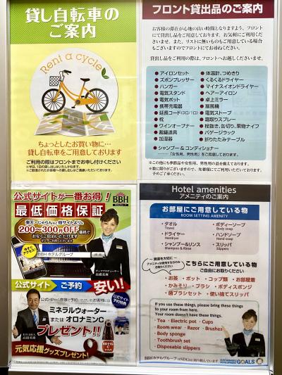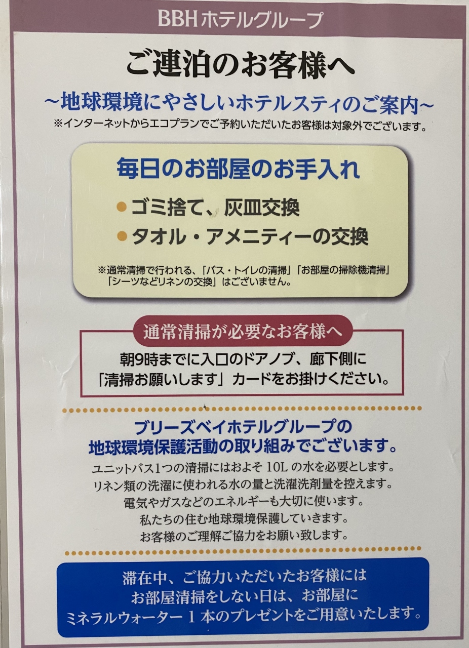 連泊する場合は、部屋の清掃不要にするとミネラルウォーター1本もらえます。また公式ホームページから予約するとミネラルウォーターかオロナミンCがもらえます。- 旅行時期