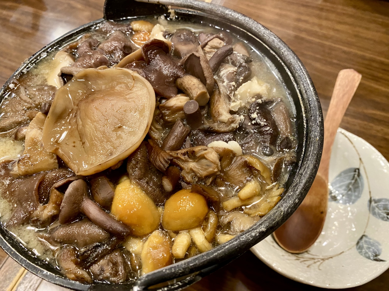 きのこ鍋は一人前で盛りだくさんなので十分満足。日本酒も地元産が豊富で楽しめました。