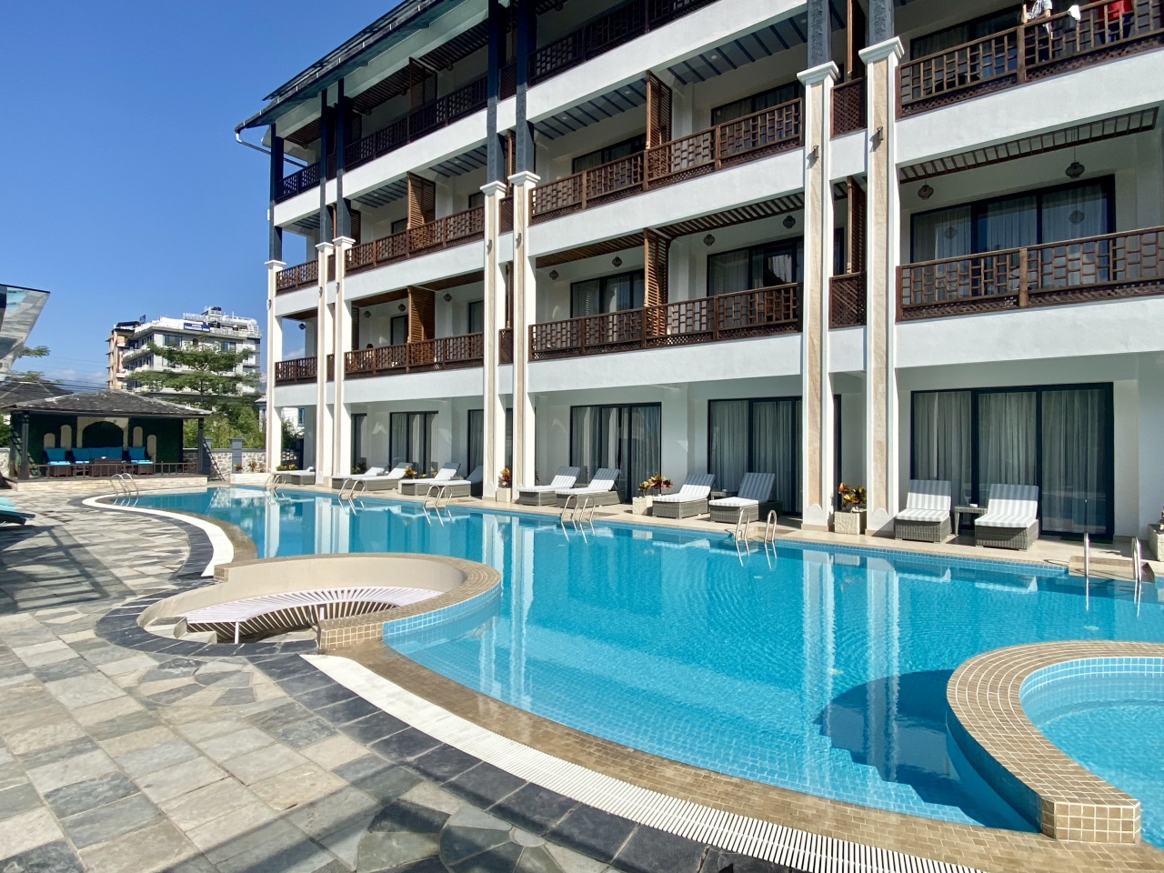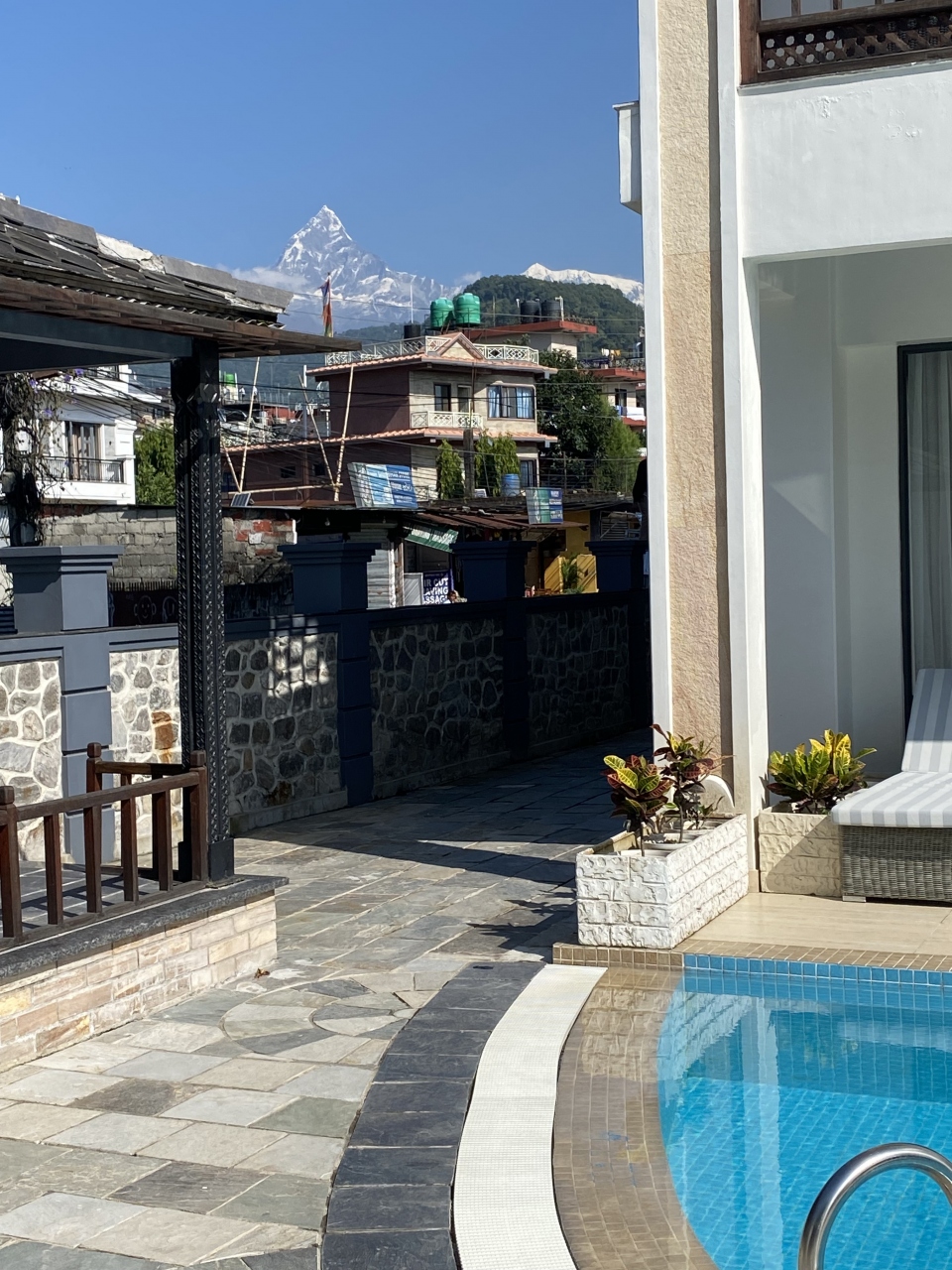 予約したプライベートハットは独立感があって良かった。ベッドが広いので、トレッキングで疲れた身体を癒すのに良かった。毎日ミルラルウォーター2本もらえるのは助かりました。テラスにテーブル、椅子もありくつろげる。タバコもテラスでは吸うことができる。飲食15%オフ付いたプランだったのでお得でした。ただし会計前にスクリーンショットを見せる方がスムースです。朝食は地元料理もあるので楽しめました。毎晩バンド演奏、民族音楽ショーもあるが21:30には終わるのが良い。スタッフは皆さん穏やかな笑顔で対応してくれるので気持ちが良いです。プールサイドの隙間からはマチャプチュレなども見えます。