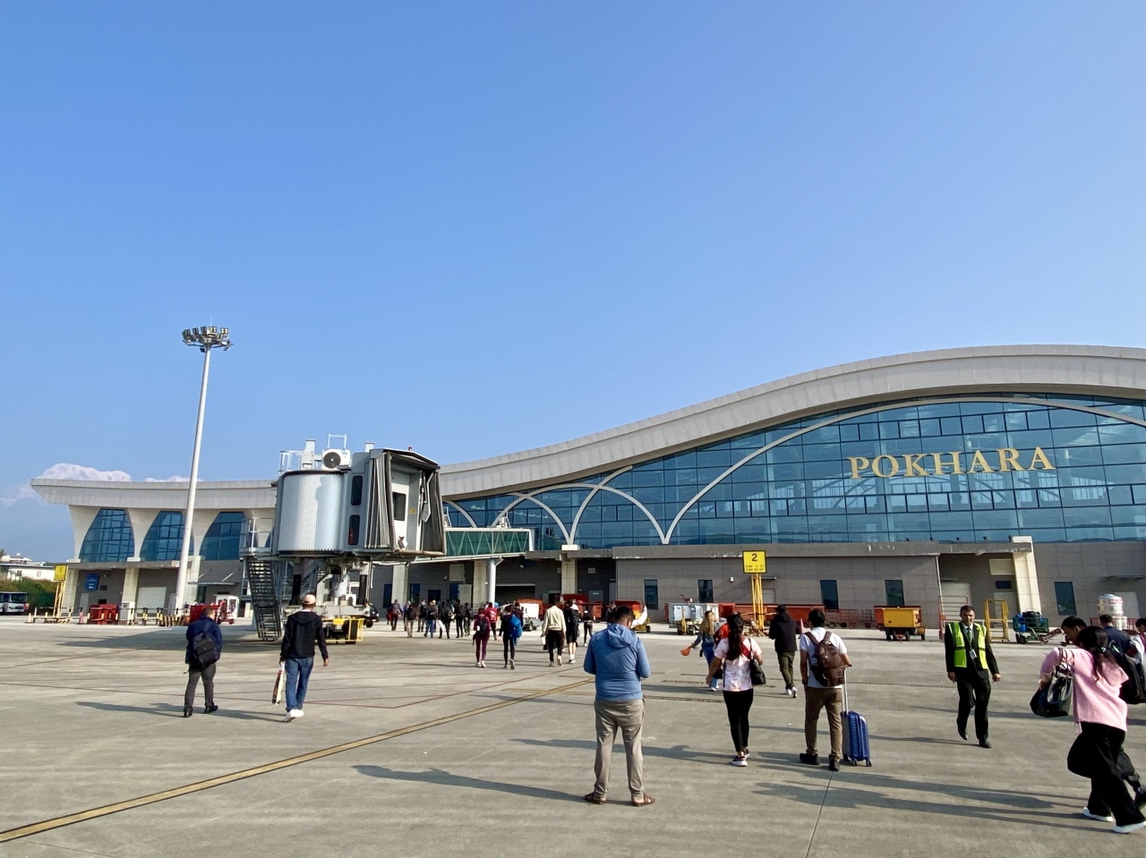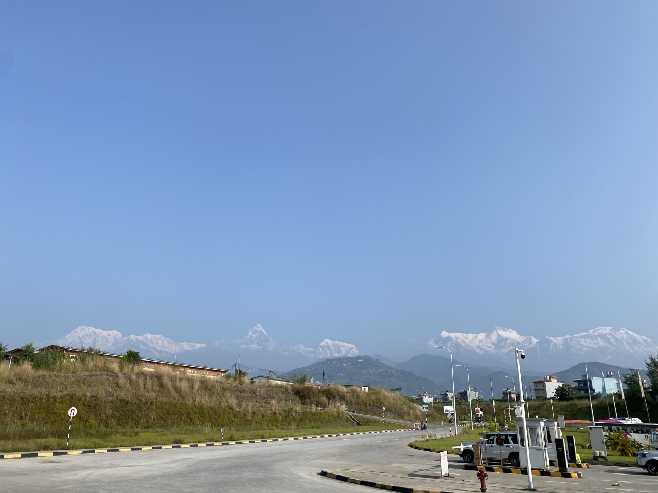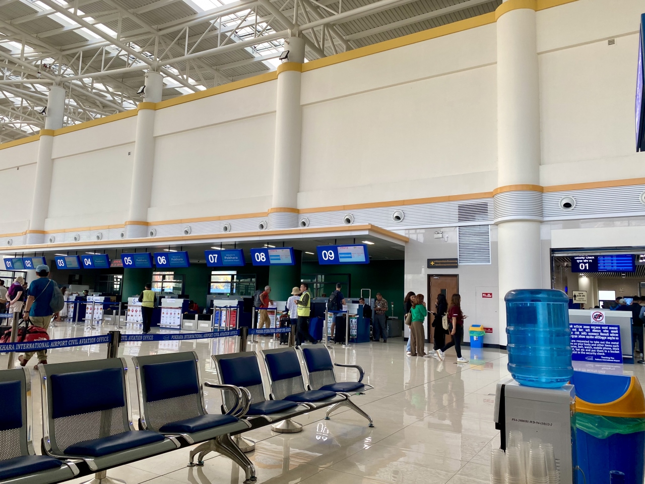 2023年1月にオープンしたばかりなので綺麗です。空港前からアンナプルナ、マチャプチャレなどヒマラヤ山脈の眺めは素晴らしいです。世界を見渡しても空港でここまで山々が見られるところは多くないと思いました。建物に入るとチェックインカウンターが9番まであり、その横がセキュリティー入口。その横にコンビニみたいな小さなお店が1つだけあります。