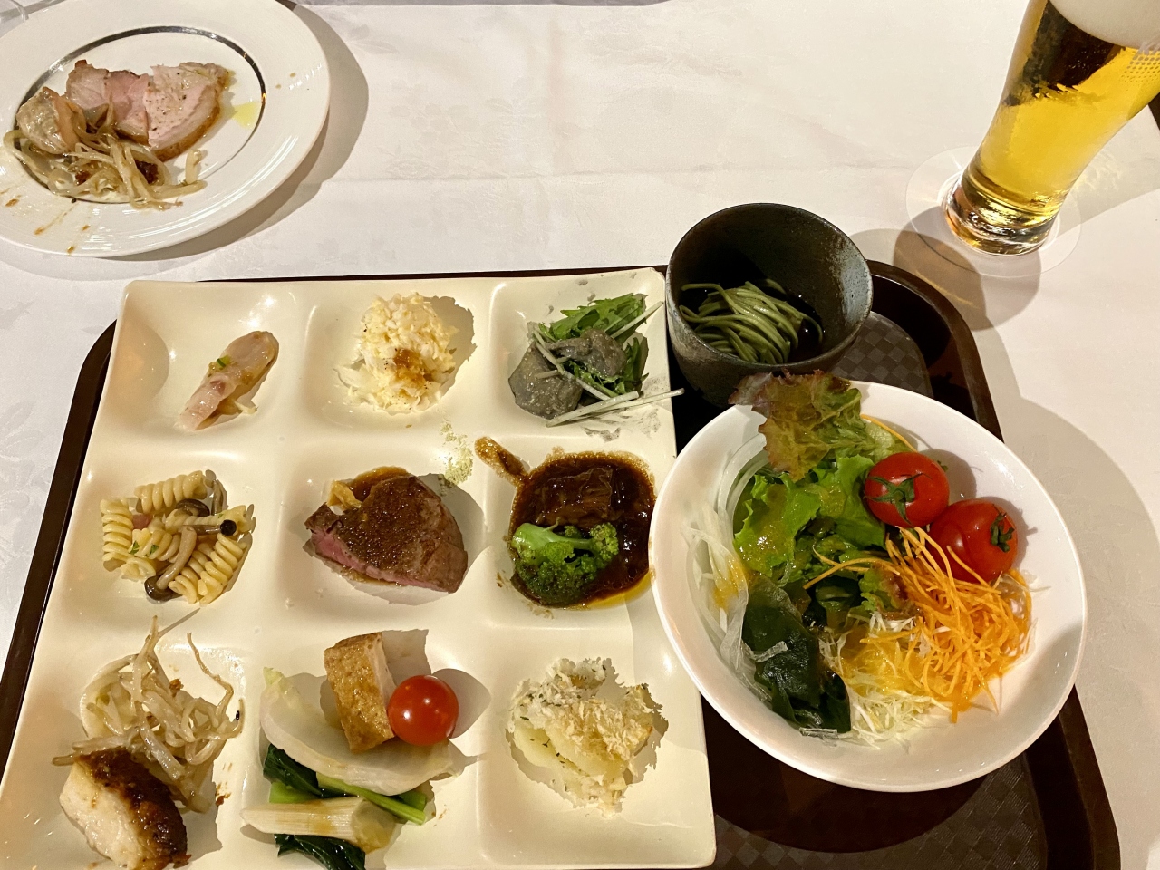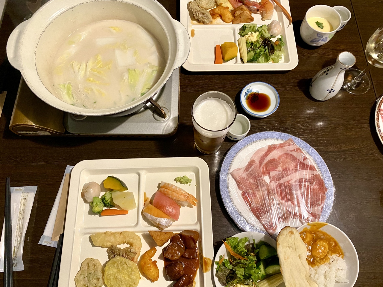 夕食は富士桜ポーク鍋ハーフバイキング90分飲み放題 のプランでした。バイキングの種類が少ないのはこの価格では仕方ないでしょう。しゃぶしゃぶは美味しくいただきました。アルコールはそれほど量は飲めないのですが、沢山飲む人ならよりコスパが高いと思います。