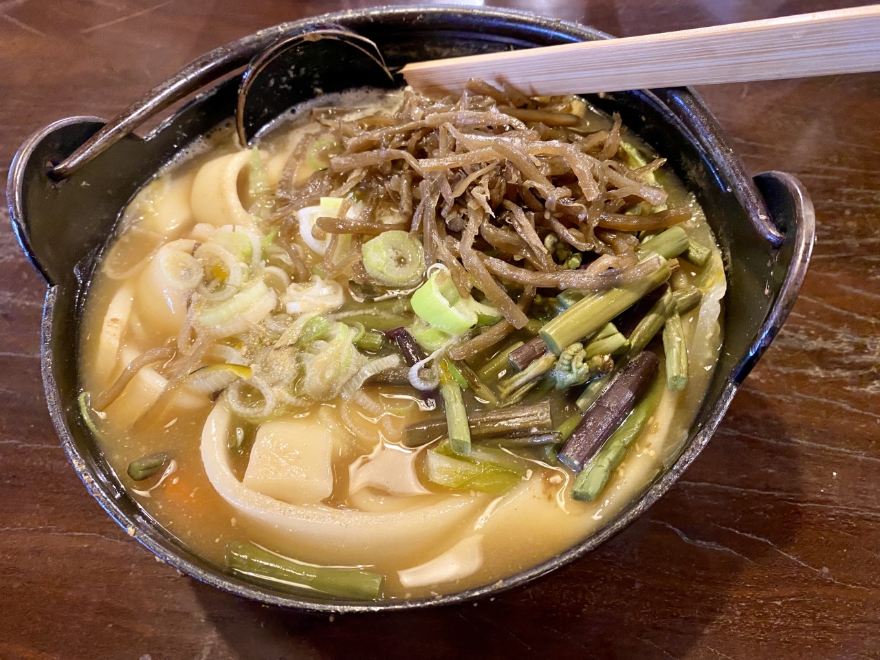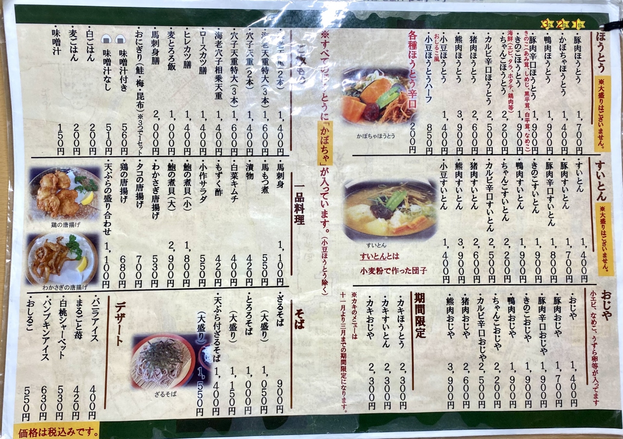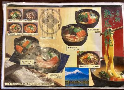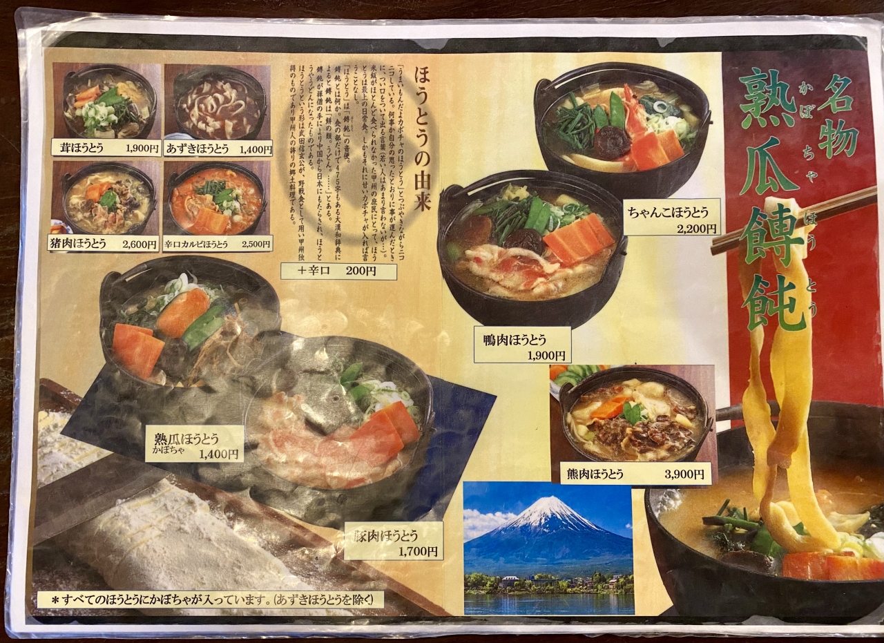私はカボチャほうとう1400円、家内は豚肉すいとん1700円にしてシェアしました。全てのほうとうにはカボチャは入っているので、他のにすれば良かった。どちらも熱々の鉄鍋に入ってくるので、熱くてなかなか食べられません。これも混雑する要因かもしれません。味噌味で美味しいです。- 旅行時期