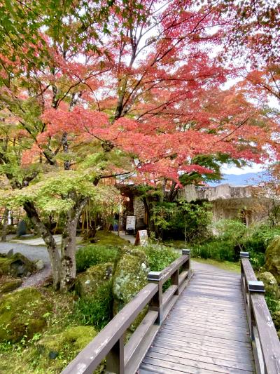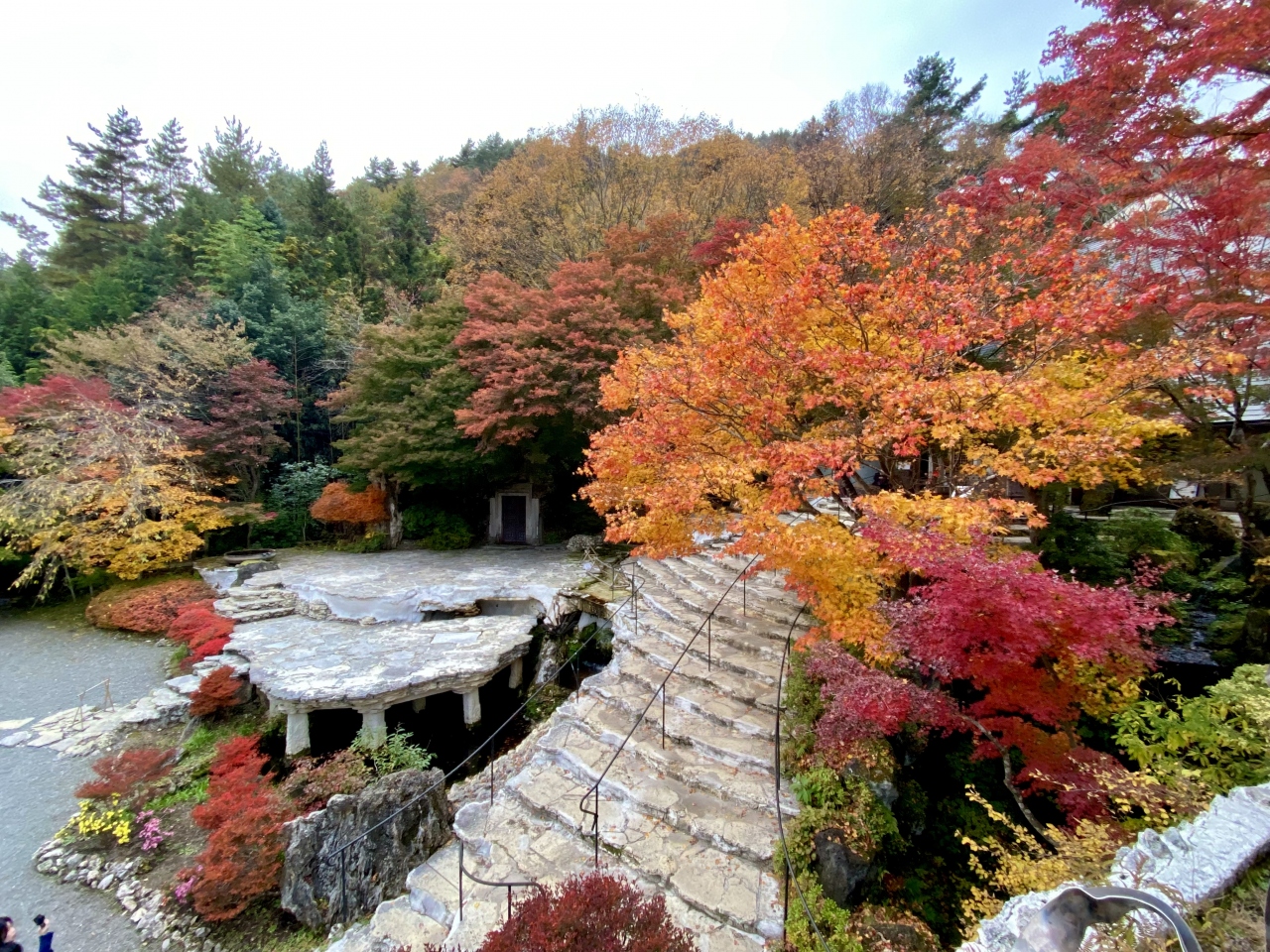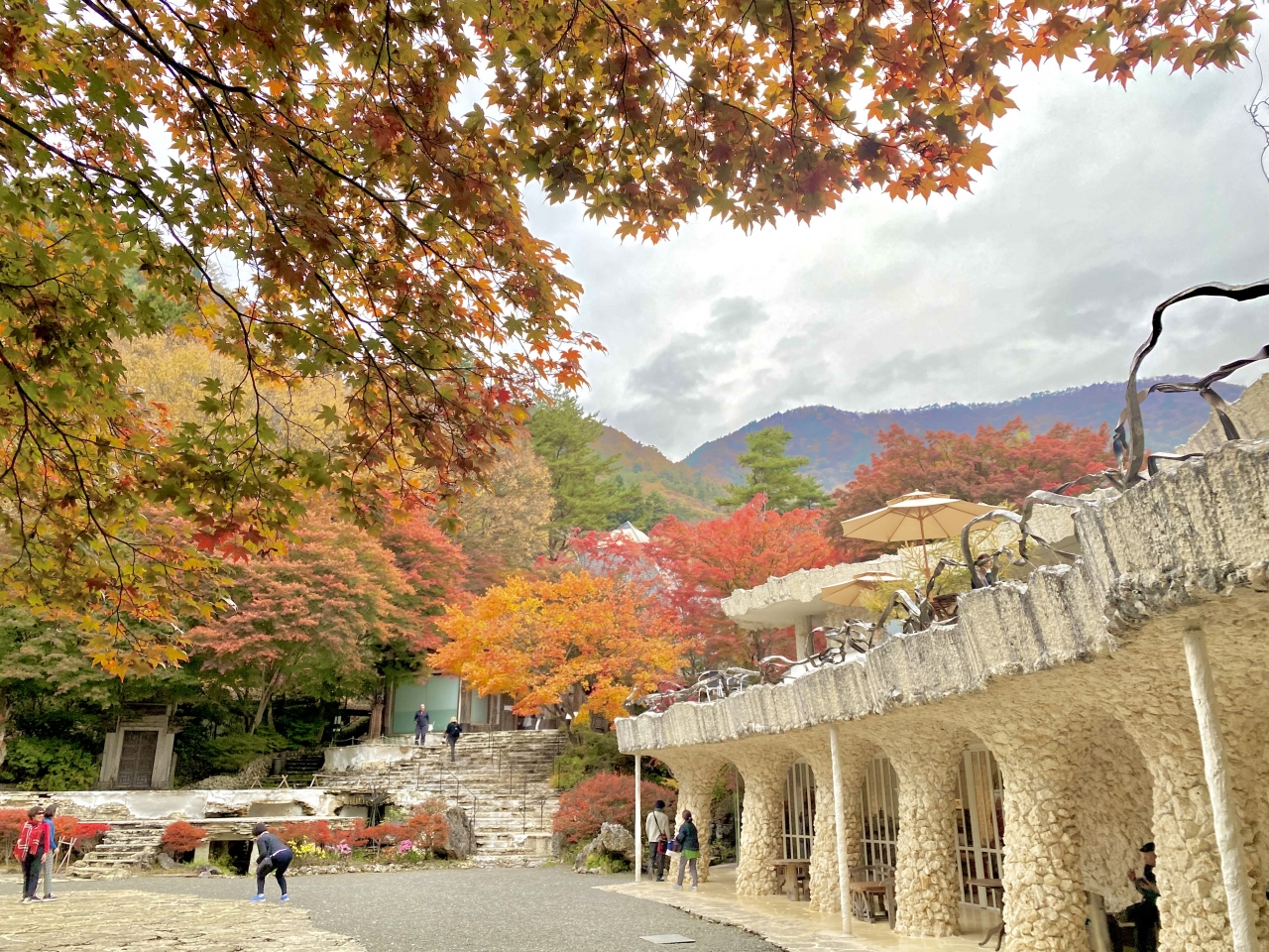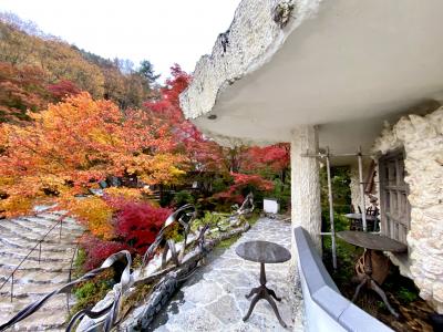 一竹辻が花の着物が有名な久保田一竹ですが、ガウディ建築を思わせる琉球石灰岩の建物と紅葉のコントラストに、感銘を受けました。帰る時に気が付きましたが、ミシュラン3つ星を2009年から毎年受けているのです。