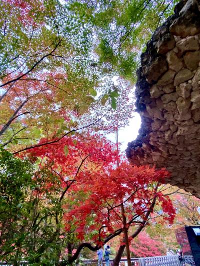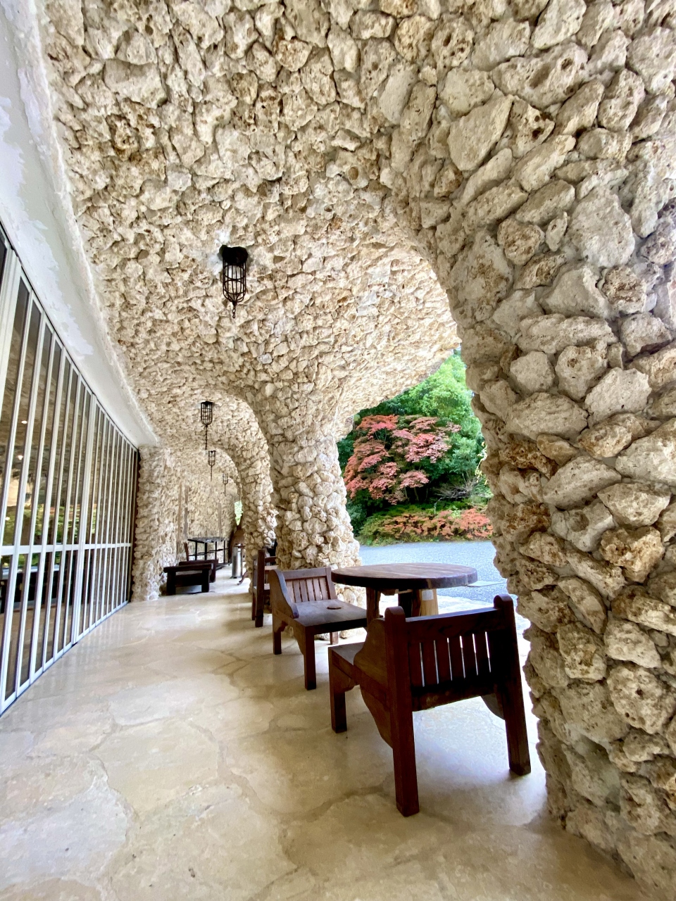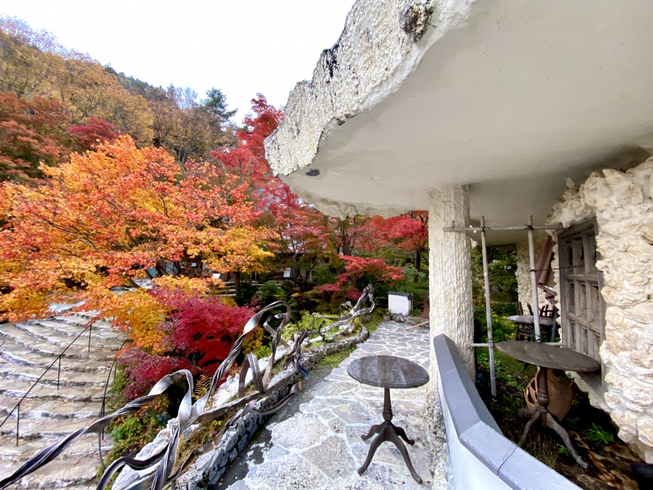 ガウディを思わせる琉球石灰岩の建物と紅葉のコントラストが素晴らしい
