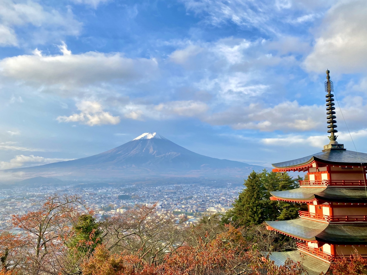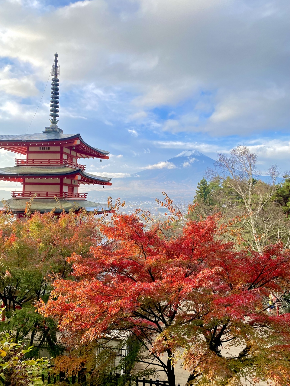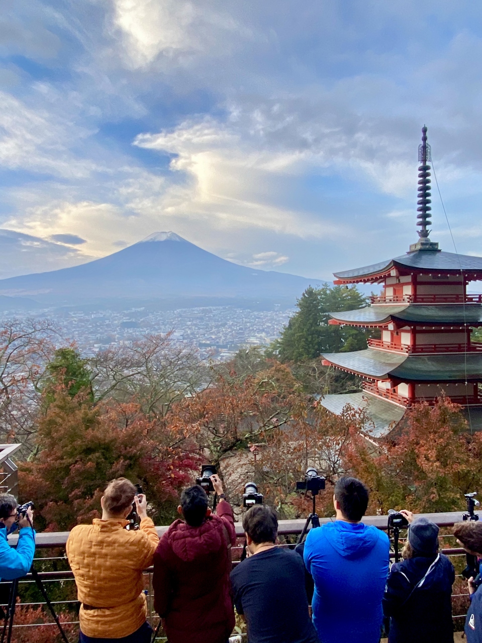 7時前到着時、多くの外国人が三脚立てて待機してました。日本を紹介するガイドブックの表紙を飾ってしまったばっかりに、突然SNS超人気スポットになったようです。人と同じ写真を撮って何が楽しいのだろうとも思いますが、富士山、五重塔、紅葉(桜)が揃えば日本の象徴みたいなもんですから、撮りたくもなるよねぇー。そう言う意味では日の出前に来るのは正解です。