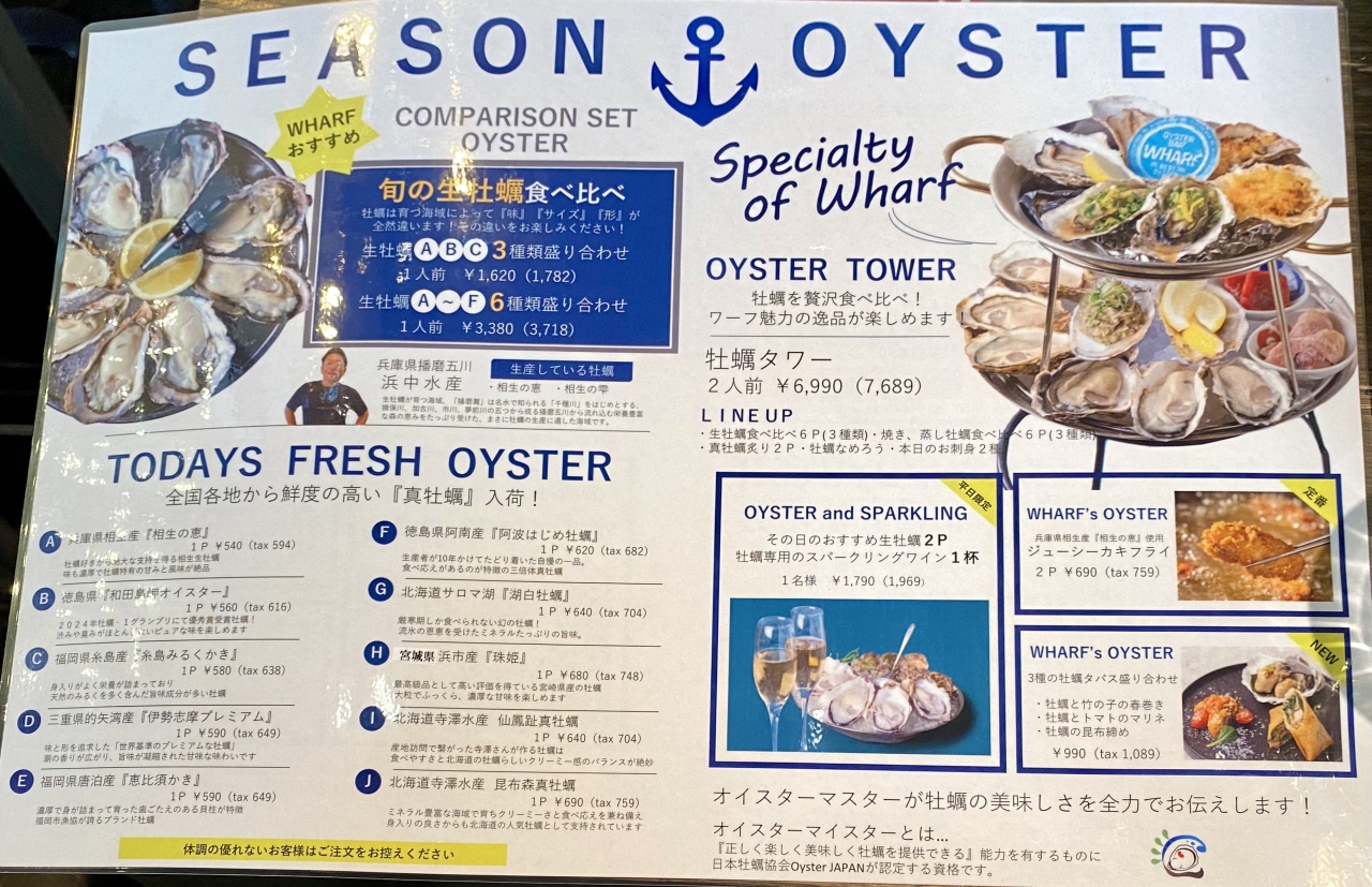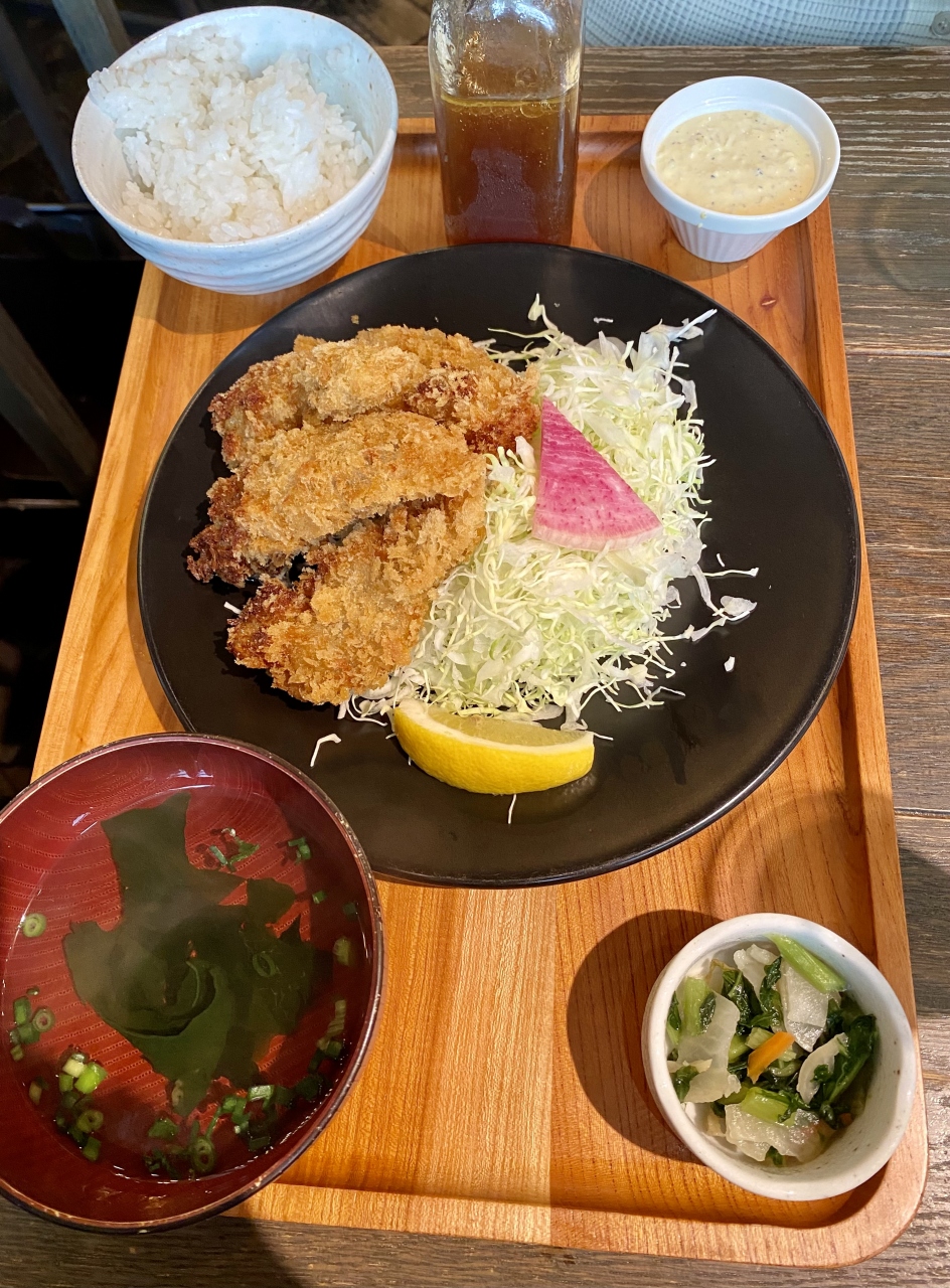 牡蠣料理が多種一度に味わえるランチの定食も魅力的でしたが、田舎では生牡蠣はなかなか食べられないので、家内と2人とも3種類の食べ比べセットにしました。美味しかったので違う3種も追加しましたので、最初から6種類にすれば良かったです。他にカキフライ定食を1つ頼んでシェアしました。