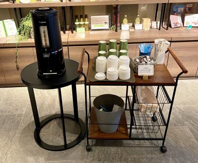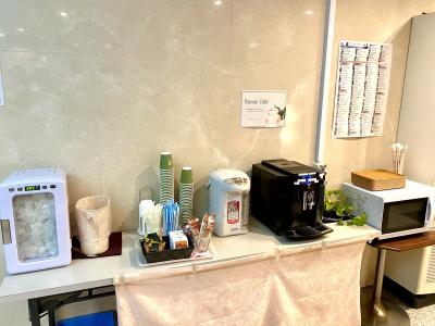 1階ロビーに無料のコーヒーがあります。給湯ポット、電子レンジがあり24時間使用できます。地下1階には無料のランドリールームがあり洗濯機、乾燥機がPm3時からAm10時まで使用できます。フロントでの貸し出し品も色々あります。我が家はゴロゴロ付きの椅子をもう一つ借りました。