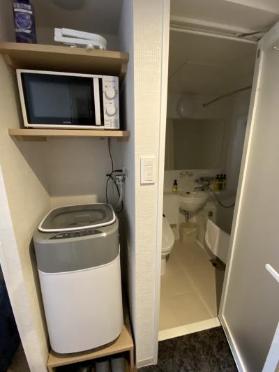 外から見ると完全にマンションです。部屋にもシンクを塞いだような所にIHがあったりして謎が深まる。建築途中で施主が変わってホテルに変更したのではないかと物語を作ってしまいました。