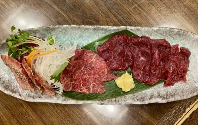 馬刺は翌日も別の店で食べましたが、生姜がチューブらしくて化学薬品の味を感じてしまいました。コチラはすりおろしなので美味しくいただけました。5種盛りは多いと言われたので3種にしましたが5種でも良かったかも。