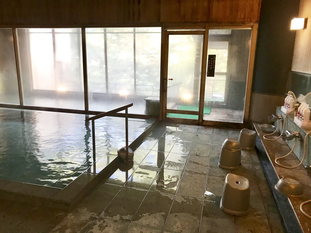 チェックイン時に言われた通り、白い湯の花がたくさんウロウロと浮いており、お肌がツルツルというよりヌルヌルする感じの泉質でしたが、温度は少しぬる目です