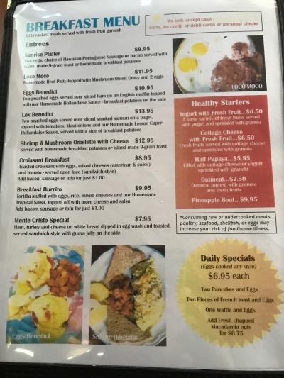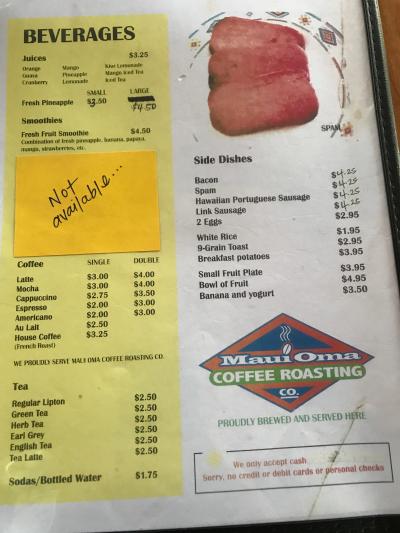 フロントストリートの図書館の横、ドール・ホイップの奥隣にあり、ローカルな田舎町の食堂といったオールドハワイを感じさせる雰囲気が好きで、もの凄く美味しい訳ではないですが、3回朝食に行きました