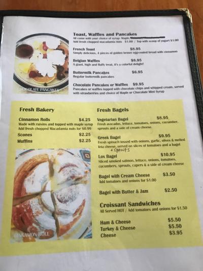 サンライズ・プラッター(9.95$=2エッグ、ベーコン、食パン)、クロワッサン・ハム&チーズサンド(5.5$)、スモールフルーツ・プレート(3.35$)、ヨーグルト・ウィズ・フレッシュフルーツ(6.5$)、フレッシュパイナップルジュースS(3.5$)、カプチーノ・ダブル(3.5$)などをいただきました- 旅行時期