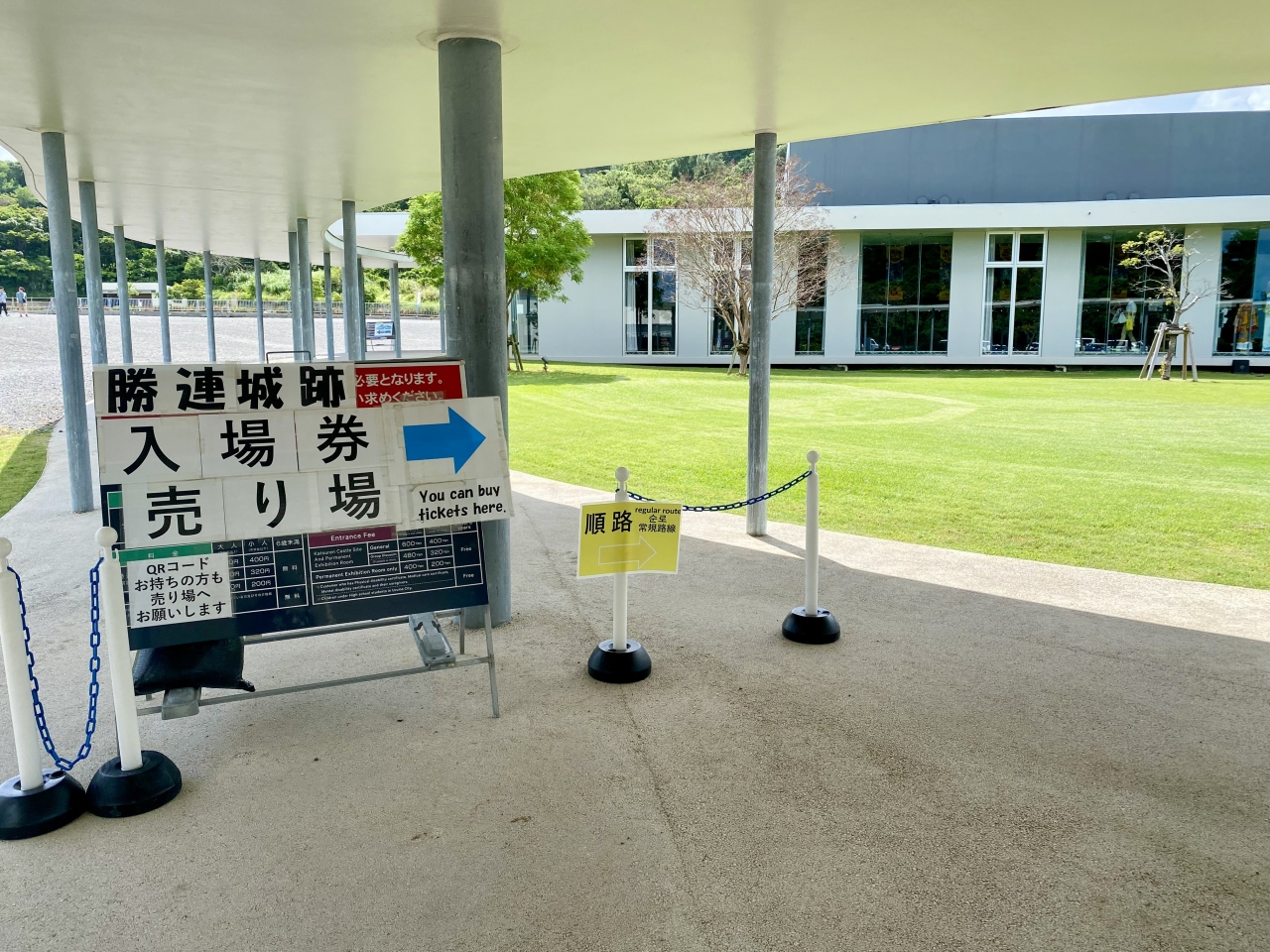 勝連城入場料とあまわりパーク込みで大人600円です。最初にパーク建物の受付でチケットを購入。城跡が先でも、展示物の見学が先でもかまいません。城跡に行く場合は道路に出てしばらく歩き横断して行きます。
