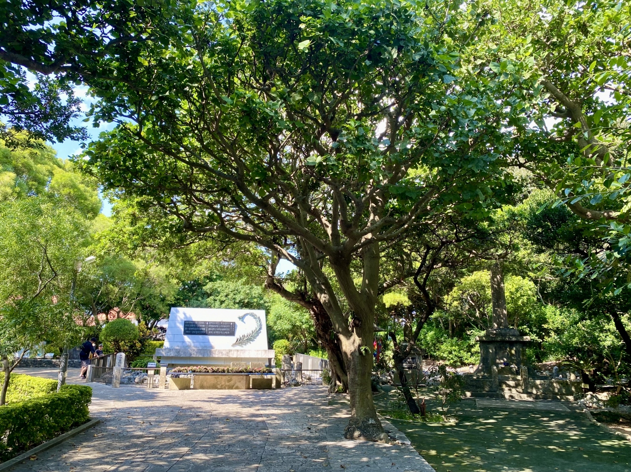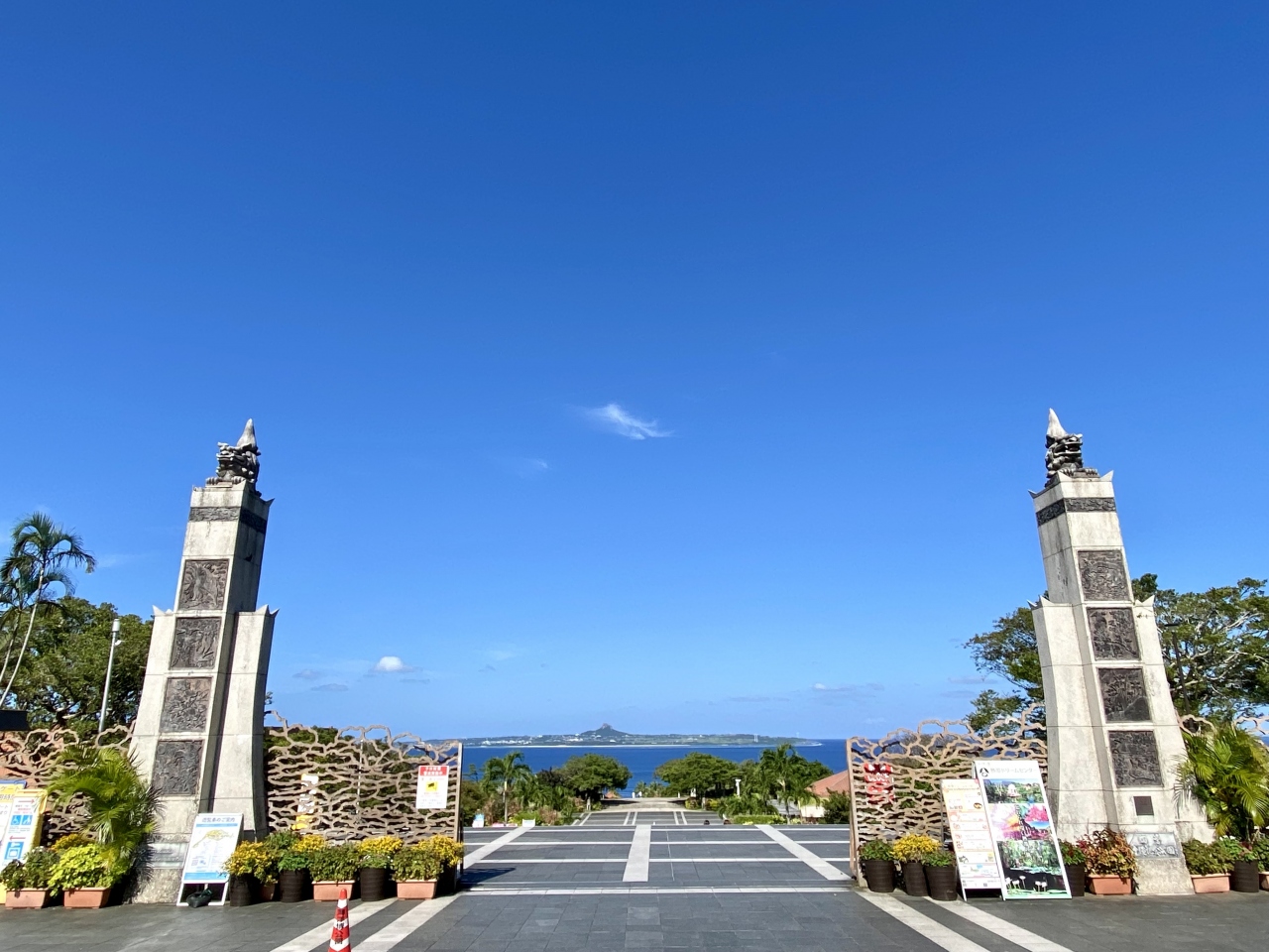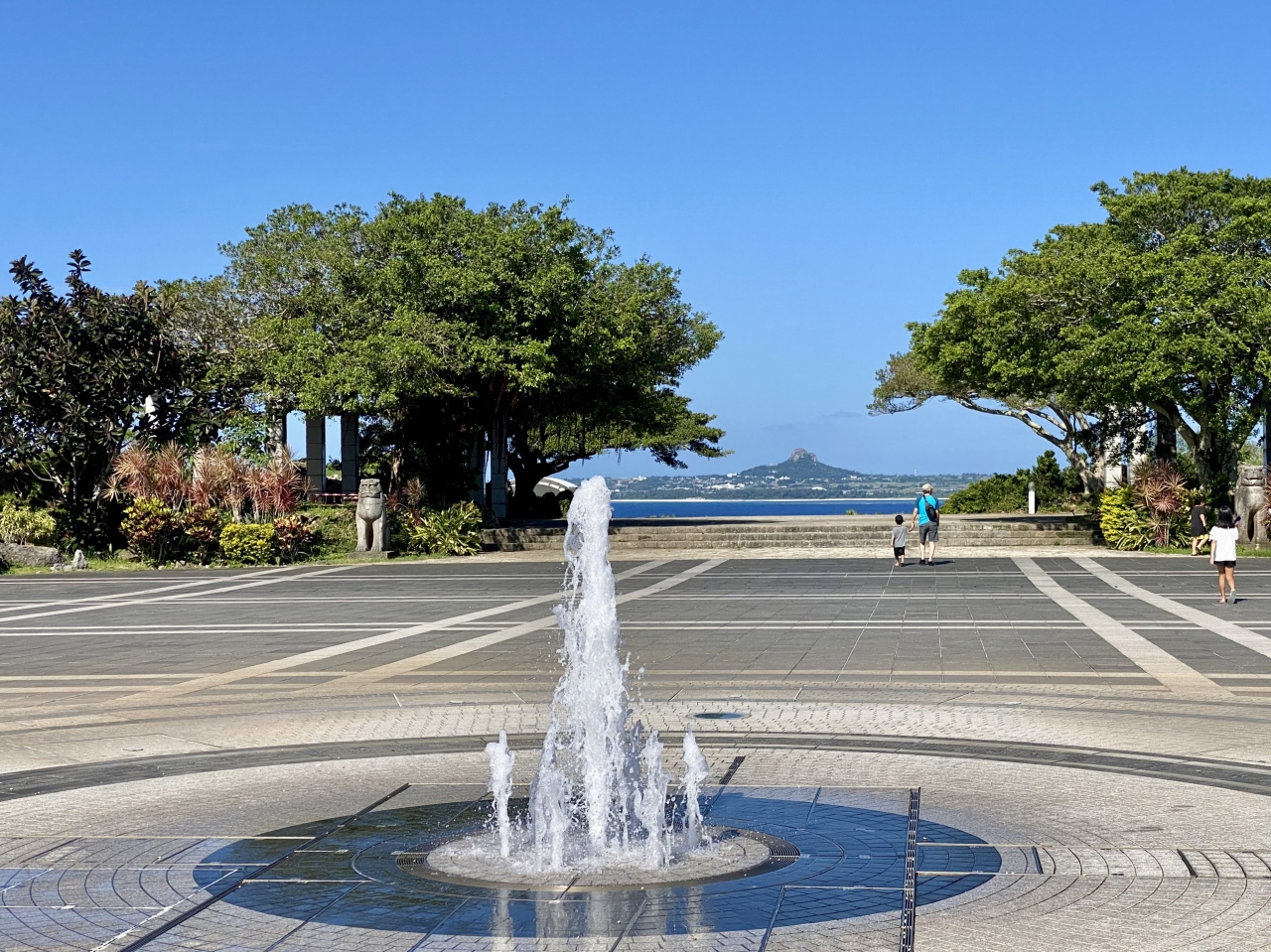 駐車場から歩いて中央ゲート門の間に立つと、思わず『おぉーっ!』と口からでました。青い海の向い側にある伊江島中央に見える巨岩の山(城山 : 伊江島タッチュー)が特徴的だったからです。さらに噴水まで降りると山が一段と目に入ります。そのように意図して道が作られたのでしょうね。フェリー30分で渡れ、山は15分で登れるようなので、次回行ってみます。