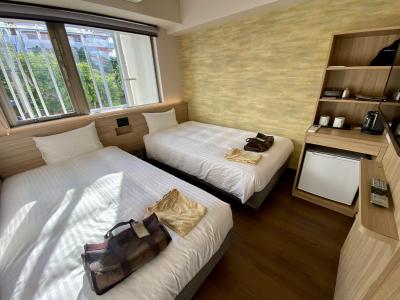 エレベーターを降りると外と繋がっており解放感がある。新しい感じで施設、部屋が綺麗。窓が開く(網戸はないが虫は入ってこなかった)。ツインルームは広くはないが、布団が気持ちいい。部屋着も作務衣タイプで気持ちいい。