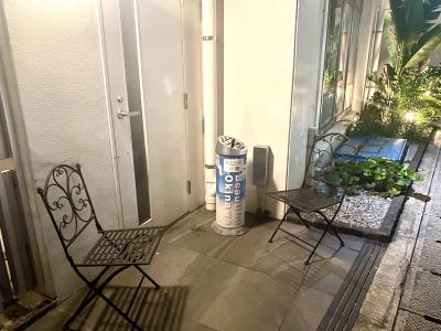 喫煙所は外にあり、レストランの窓から見えなくなるところに椅子が2つありました。雨だと傘が必要ですね。