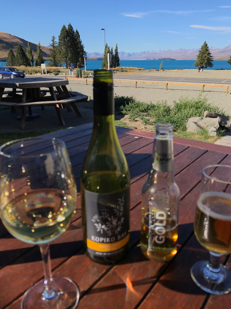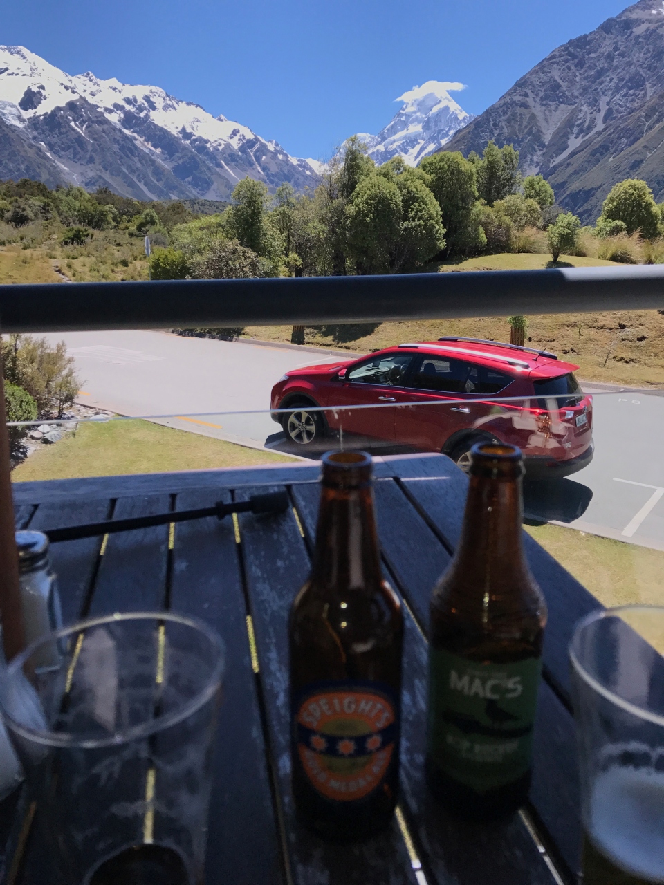 カフェ・バーのテラス席からは正面にマウントクックが見えて、天気のいい日にフッカーバレーを歩いてきて、最高の気分でビールが飲めました