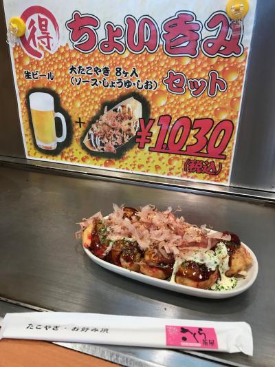 夕食は芦原温泉のホテルで取るため、二人で一つ「ちょい呑みセット」を頼んで、生ビールとタコ焼きをシェアーしました
