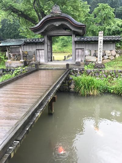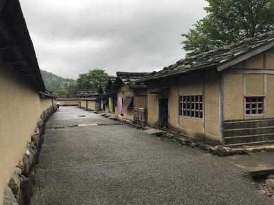 町並、一乗谷朝倉氏遺跡を歩いてから、来た時に下車した復原町並バス停から乗る予定が、時刻表を見間違えていて乗れなかったため、雨の中を歩いて一乗寺朝倉氏遺跡資料館まで30分ほど歩いていきました