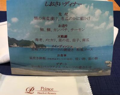 夕食は平日で空いていたので、ブッフェではなく和食のコースでした。味はまずまずでしたが、量が多すぎなかったので良かったです。宮崎の冷酒も美味しかったです。焼酎の飲み比べセットも飲みました。
