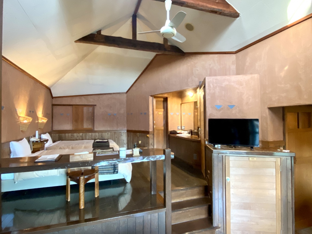 中に入ると下の段には椅子とテーブル、バスルーム。上の段にはベッドルーム、洗面、トイレ、クローゼット、冷蔵庫など。下の段の長椅子内部には暖房がついていました。10月でしたが夜は寒くてつけました。あとシーリングファンが空気循環用に付いています。夏場なら高地だしこれだけで涼しいのかも。コーヒーは豆を自分で挽いて入れる式。挽いたことない人には楽しいかもです。