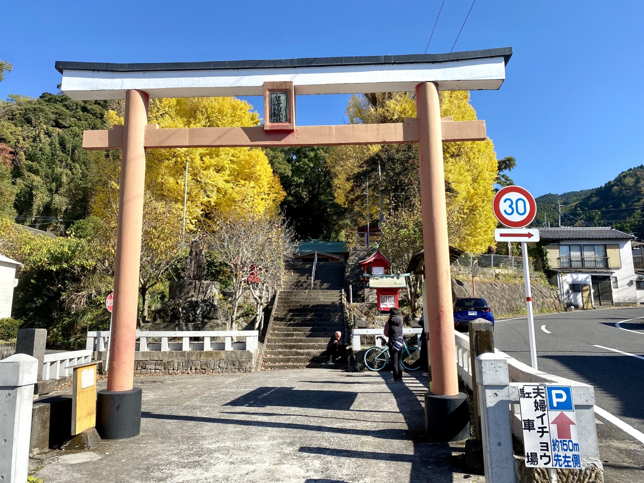 駐車場の奥に小道があり小学校跡地の横を下って行くと神社の境内になります。社殿に参拝するために、一旦石段を降りて鳥居から正式に入り直しました。