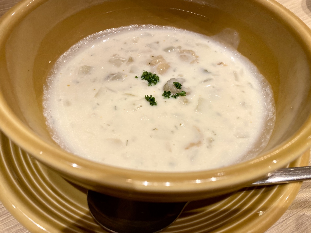 ちなみに家内は単品でクラムチャウダー(スモール)、蟹と蟹みそのスパケディ(スモール)、私はウニとたらこの濃厚トマトクリームソース(レギュラー)でデザートはクリームブリュレとコーヒーのセット。これらをシェアしながらいただきました。店内に飾られている写真や絵はイタリアの観光地のものが多くて、行ったところもあり懐かしかったです。- 旅行時期