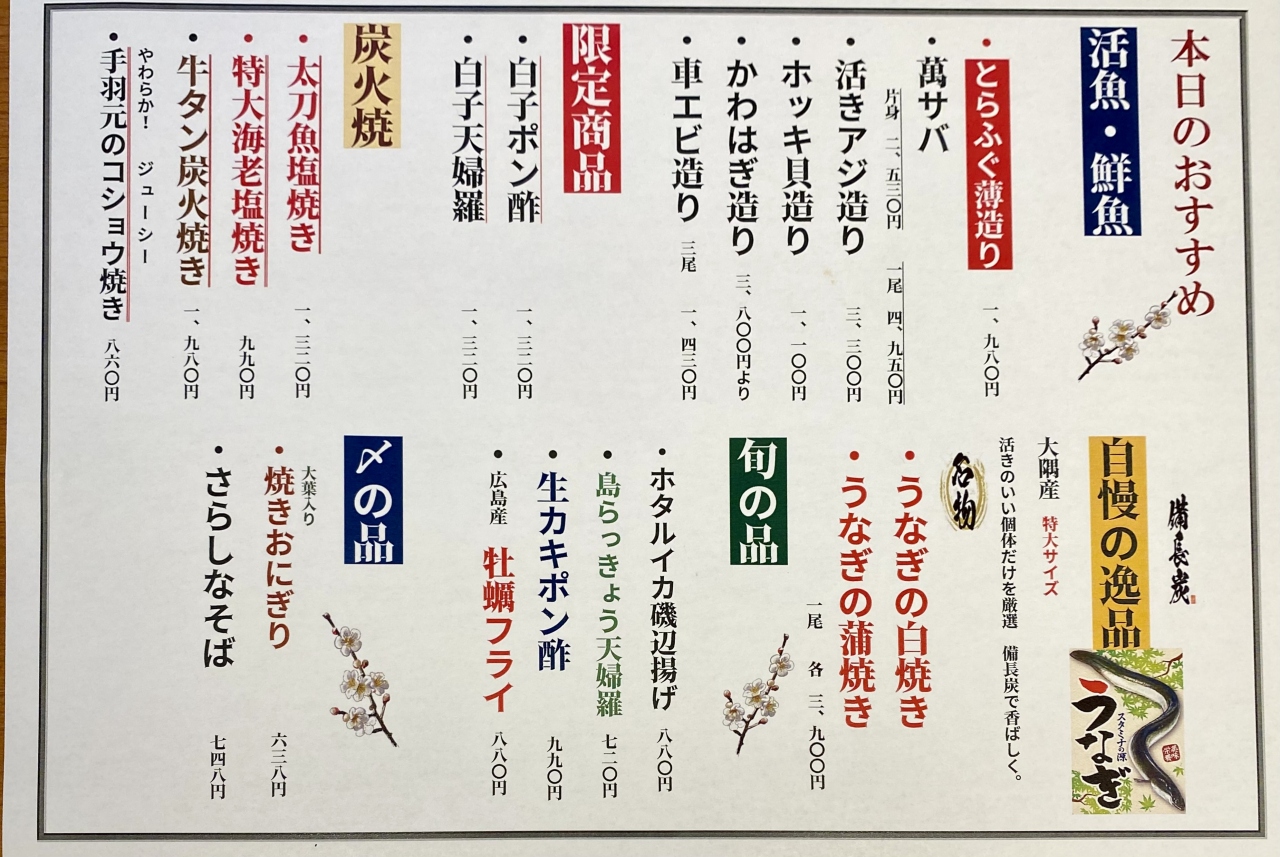 ここは当日のお勧めに旬の食材があり、価格もそれなりなので又行きたいと思いました。
