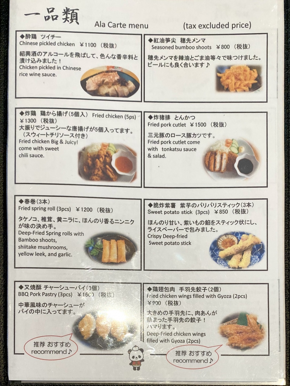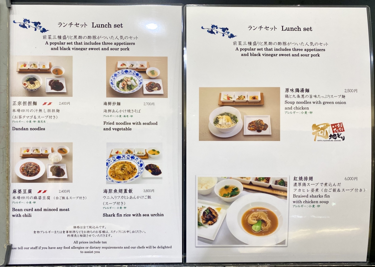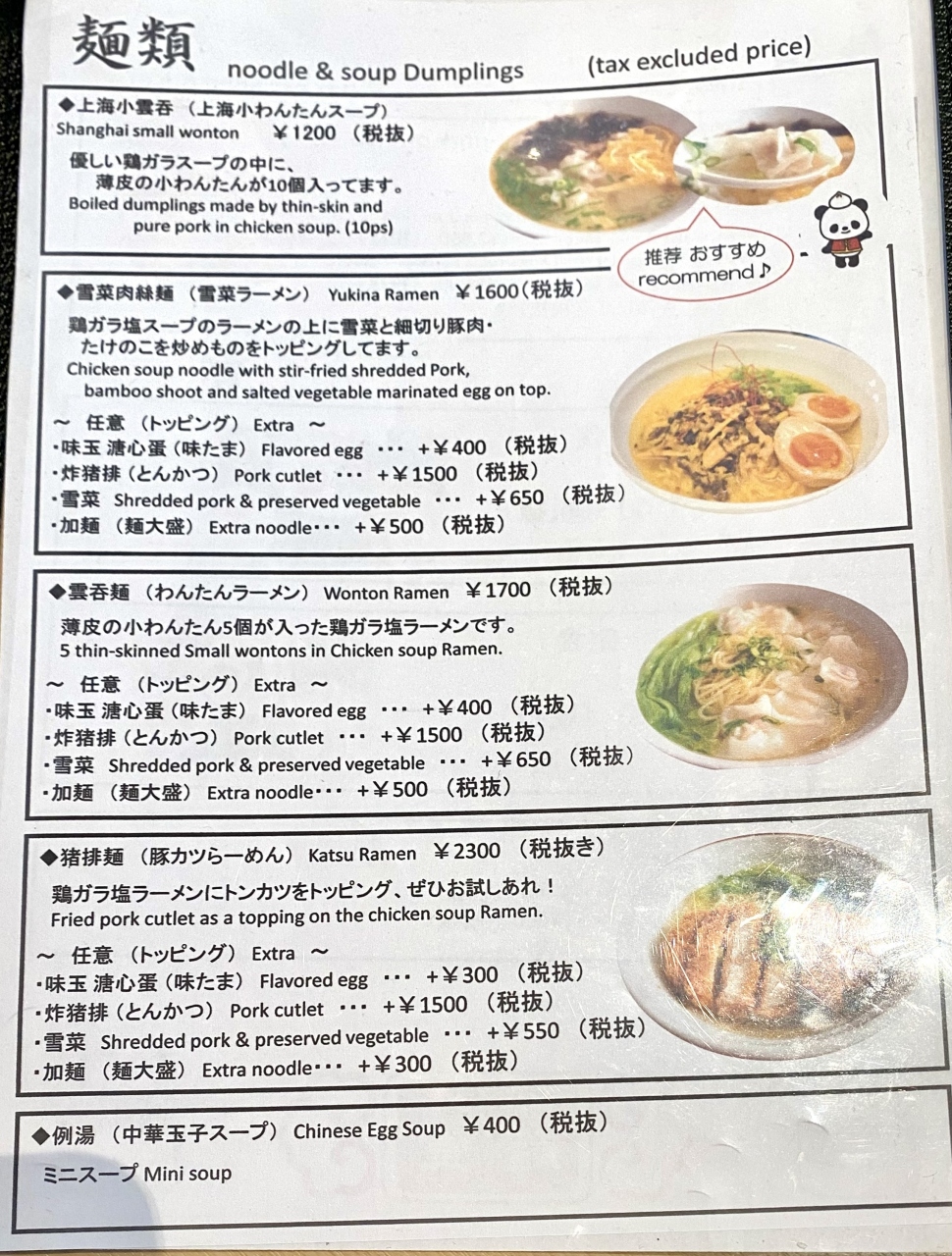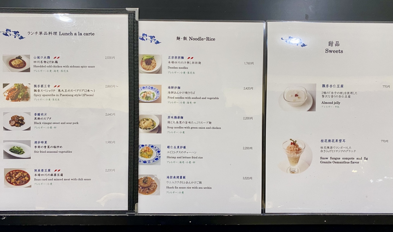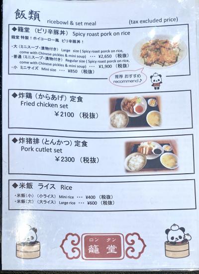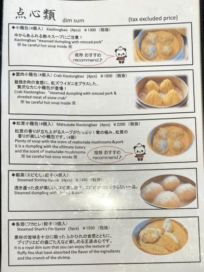 店内は大衆食堂のような簡素な造りで、スタッフは日本人でした。メニューは点心類(1,300円から2,300円)がメインですが、一品料理(800円から2,500円)、麺類(1,200円から2,300円)、ピリ辛豚丼(850円から2,650円)、ご飯付きの定食(2,100円から2,300円)などもあります。