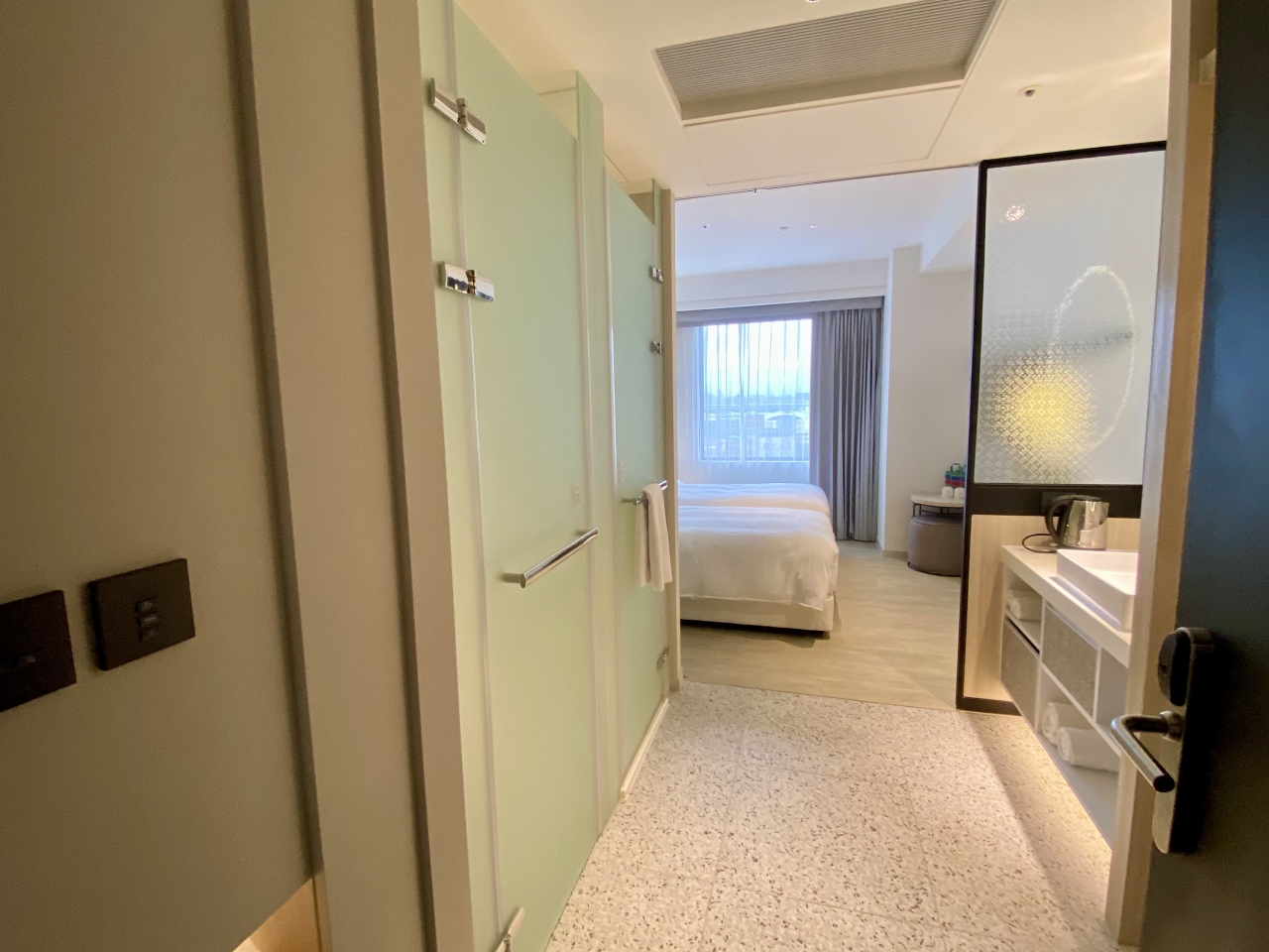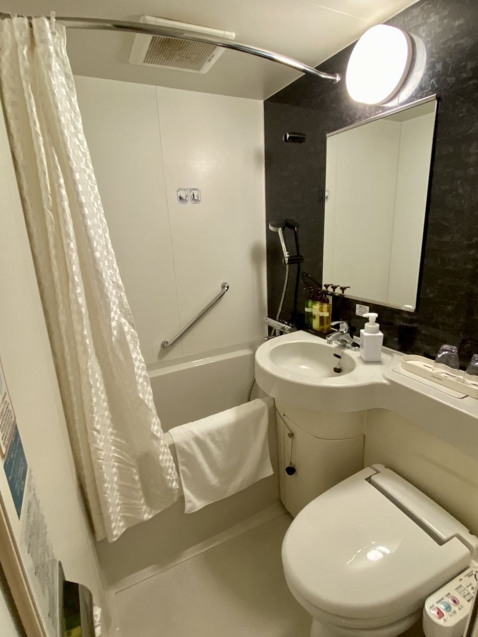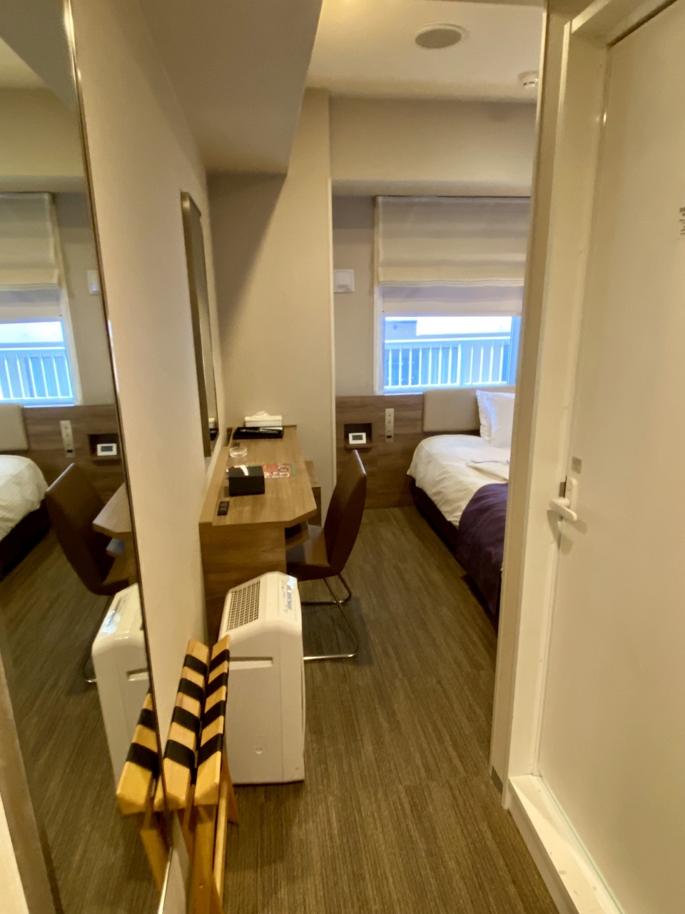 部屋はまあまあのサイズ感ですが新しいので綺麗です。窓が開くのは喫煙者には助かります(ただし、ブラインドを開けると隣のマンションから丸見えです)。空気清浄機もありました。バスルーム、トイレはビジネスホテルサイズですが、新素材なのかシャワーの際にカーテンがまとわりつきにくくて良かったです。部屋着は上下セパレートのタオル生地、スリッパは使い捨て。