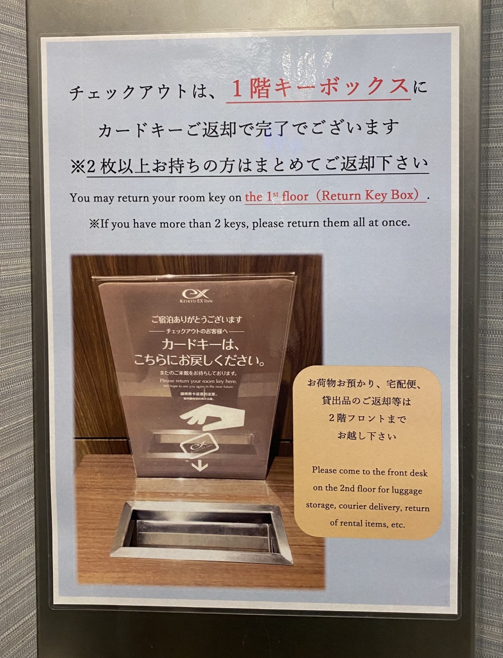 チェックインは機械で自分で行います。予約のQRコードをスマホに入れておくと早いです。
