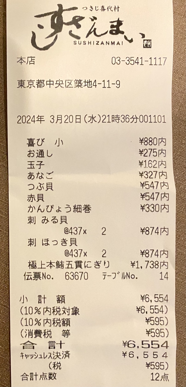 貝類が好きなので、ミル貝、北寄貝のお造りからスタート。本鮪の5貫握りが通常より千円ほどお得だったのでいただきました。大トロは脂っこ買ったですが、他は美味しかったです。あと、つぶ貝、赤貝、煮穴子、玉子をいただき、日本酒1合、お通しを入れて税込6,554円は予想より安かったです。