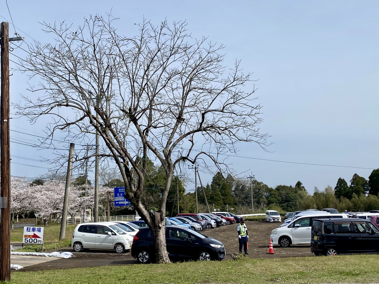 駐車場は桜並木近くの臨時有料駐車場は500円、無料の所は横市駐在所横、県農業試験場にあります。10時少し前だったので並ばず入れましたが、12時半頃に帰る際は大変な行列でした。