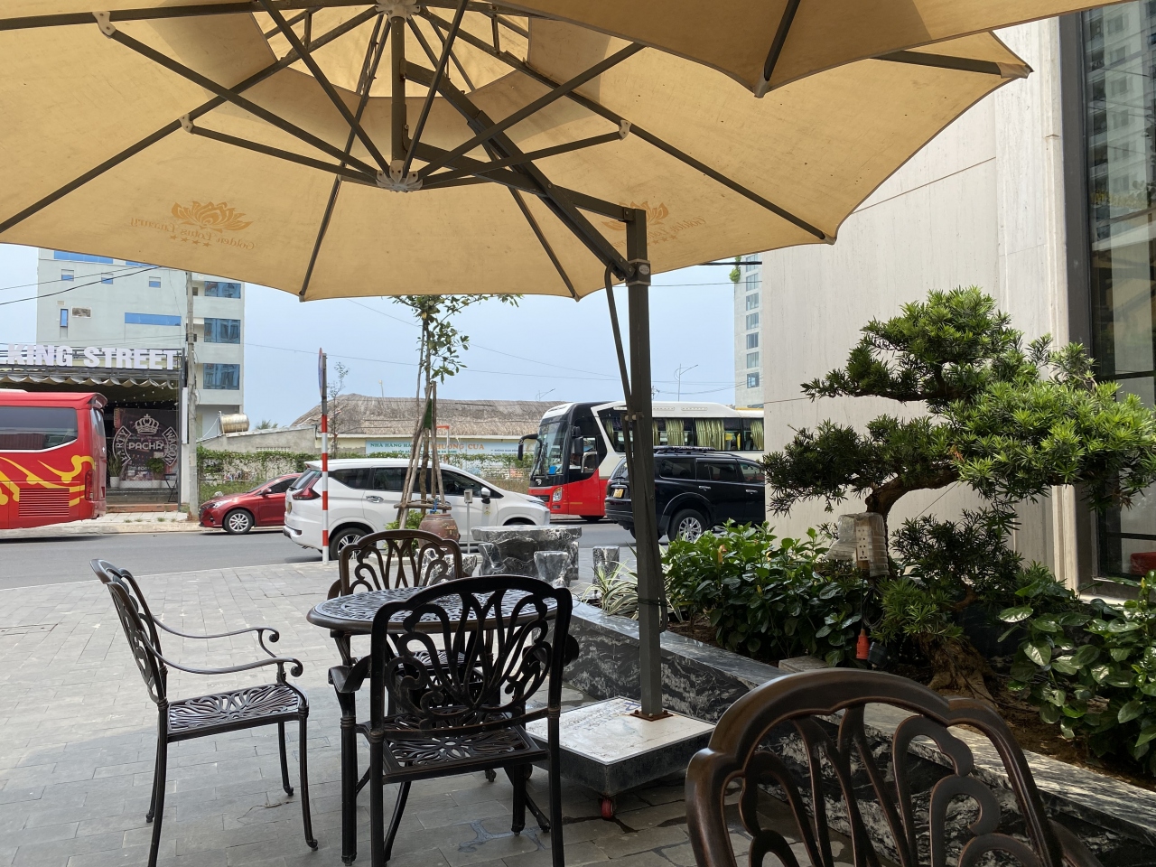 外には日よけのあるテーブル、ベンチがあり、こちらにも喫煙エリアがあります。ビーチから帰って来た時用の足洗い場もそこにあるので、ビーチ帰りにはここでくつろぎました。ビーチには歩いて5分くらいです。最後の大通りは朝しか信号が作動していなくて、渡るのにコツと勇気と決断力が必要ですが、そのうち慣れます。ビーチタオルはフロントで借りて行きます。返却はフロントでも良いですし、プールに行った時にシャワールームやプールバーで返しても 良いです。