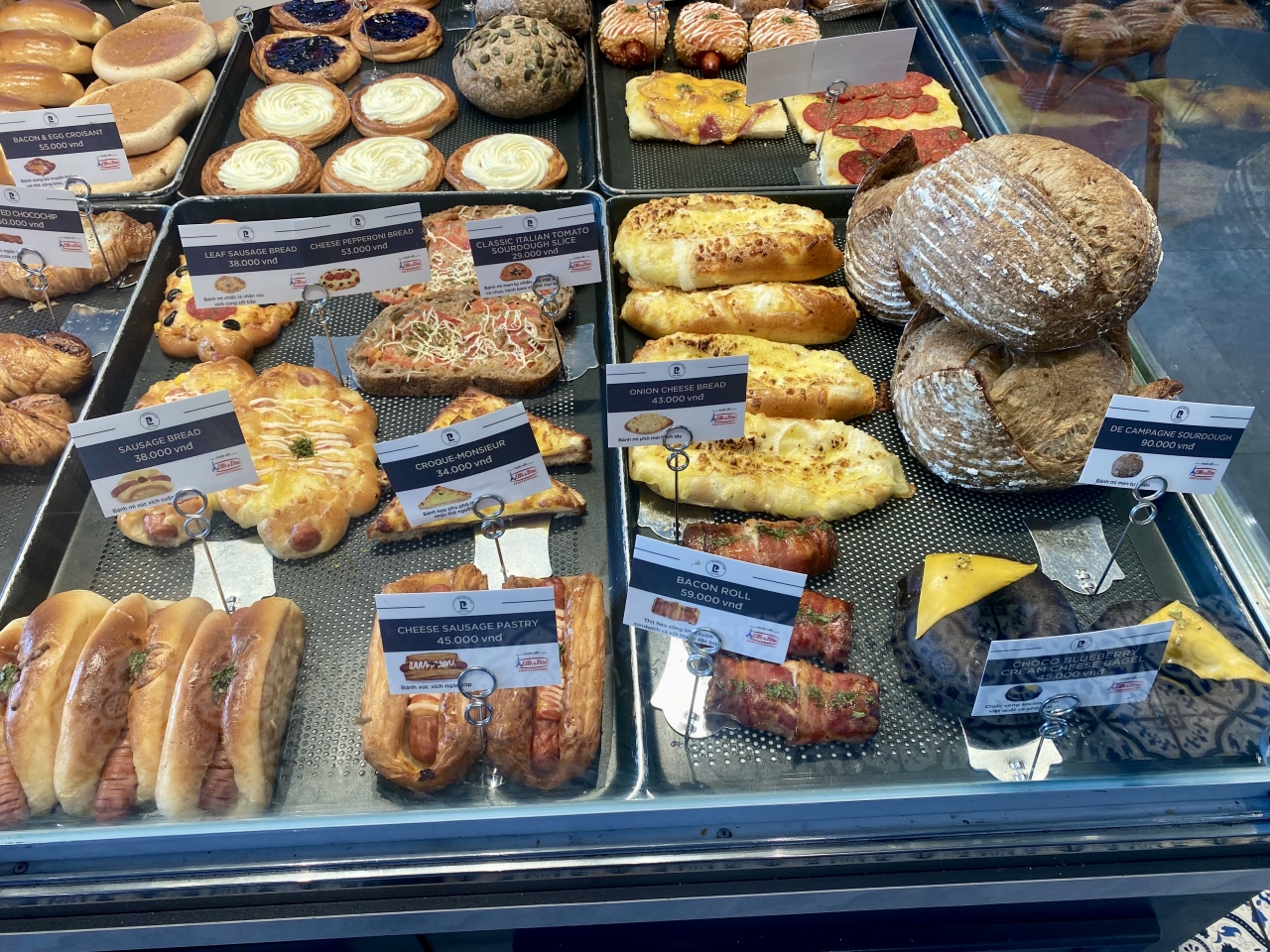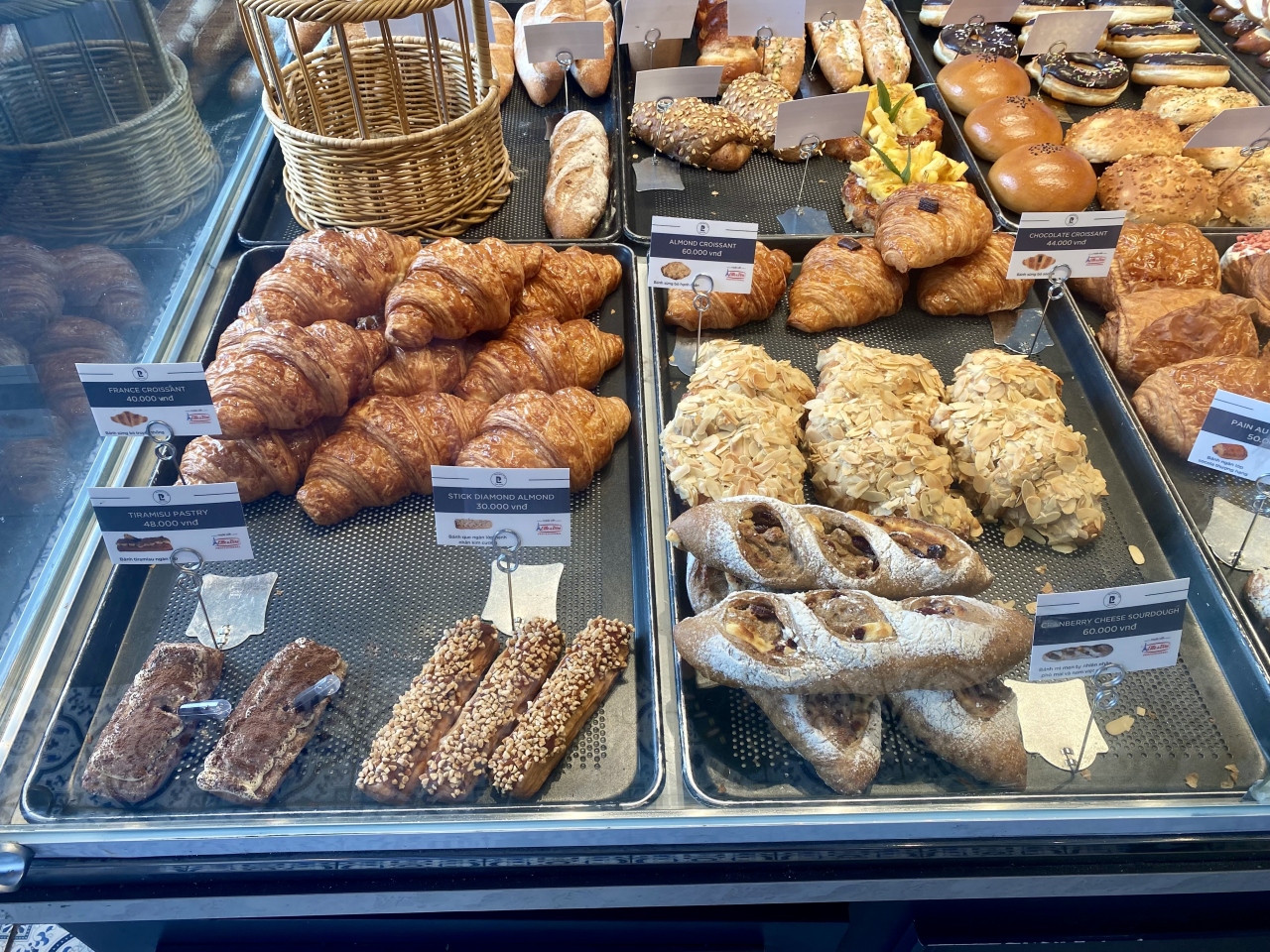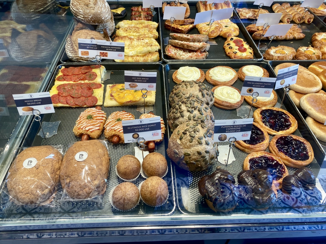 Webで検索した際、ヨーロッパのパンで一番好きなラウゲンロール(ジャーマンソフト・プレッツェル)が写真に掲載されていたので楽しみにしていました。36,000ドン(220円)という安さだったので驚きでした。スイスなら倍以上はしそうです。独特の香りと食感が大好きなので、2回目にも買いました。そのまま食べても、サンドイッチにしても美味しいパンです。他にも沢山の種類が出ていて迷うほどでした。カヌレも美味しかったです。