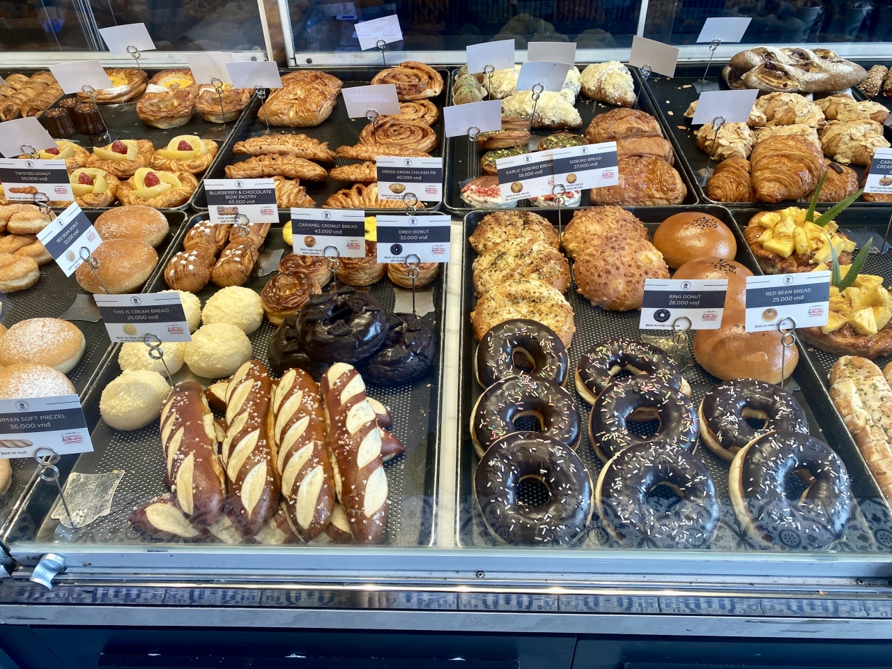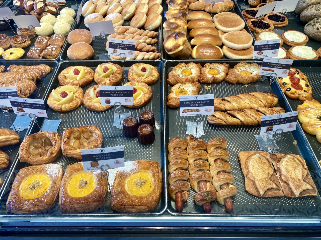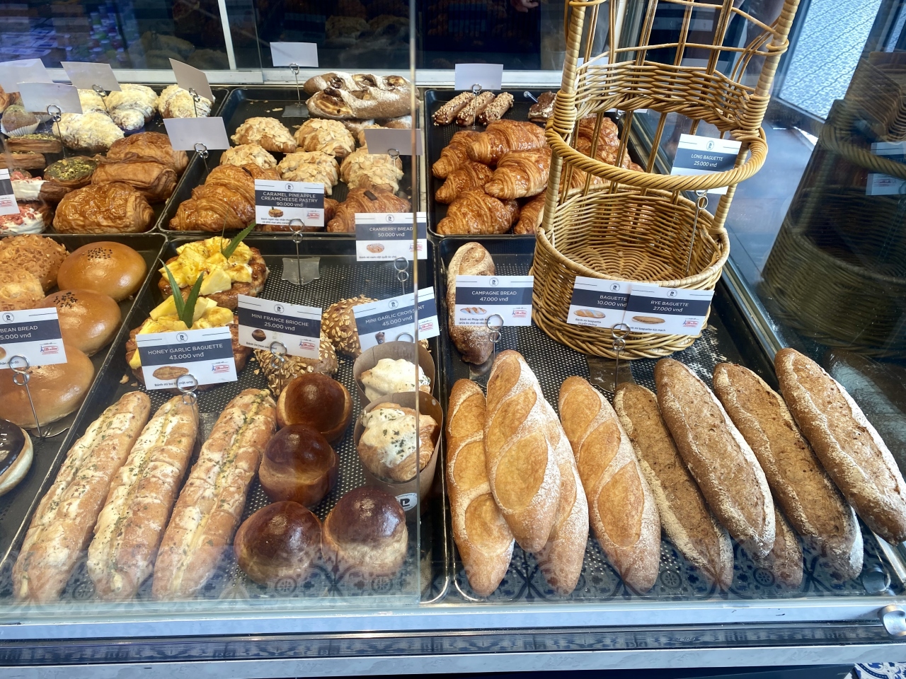 Webで検索した際、ヨーロッパのパンで一番好きなラウゲンロール(ジャーマンソフト・プレッツェル)が写真に掲載されていたので楽しみにしていました。36,000ドン(220円)という安さだったので驚きでした。スイスなら倍以上はしそうです。独特の香りと食感が大好きなので、2回目にも買いました。そのまま食べても、サンドイッチにしても美味しいパンです。他にも沢山の種類が出ていて迷うほどでした。カヌレも美味しかったです。
