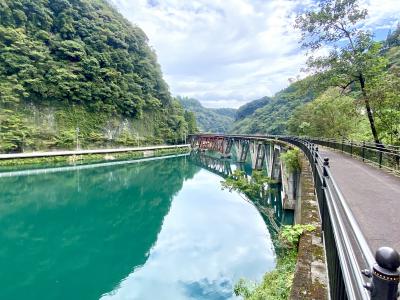 長い散策コースもありますが、今回は時間がないので橋だけ渡ってみました。当時としては近代コンクリート構造物の最先端だったようです。橋の上かせ眺める風景は上流、下流とも川面に山々の緑が映って素敵でした。