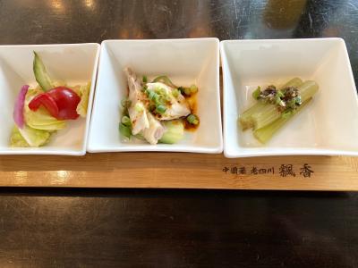四川料理のお店なので、麻婆豆腐にすればよかったなぁ。ランチで食べる気分じゃなかったので、海鮮焼きそばのランチセット(2,700円税込)にしました。最初に出た前菜3種盛りは、四川っぽい香辛料が効いた味わいでしたが、見た目は綺麗ですが特に印象に残るほどのものではありませんでした。