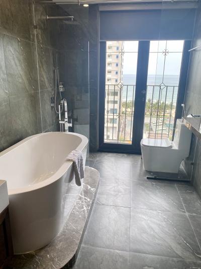部屋はソファ、テーブルもあり充分にくつろげる広さです。部屋の窓からは高層ビルの間から海が見え、サーファーとしては波の状態が確認でき眺めも良かったです。バルコニーは風景を見るためだけの広さです。バスタブ、シャワーが分かれているのは便利でした。バスタブに浸かるのに2人で交代時にお湯を入れ替えなくて済みますから。