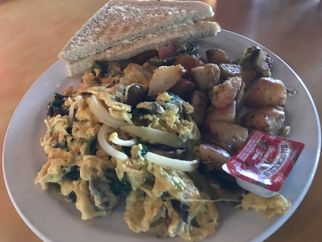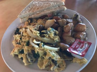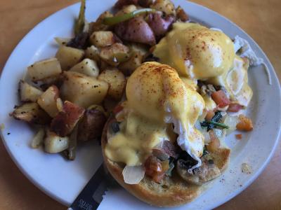 マッシュルーム&スピナッチのスクランブル(14$)、エッグベネディクト(16$)、サイドフルーツ(6$)、コーヒー(3.5$)、スムージー(6$)などいただきました