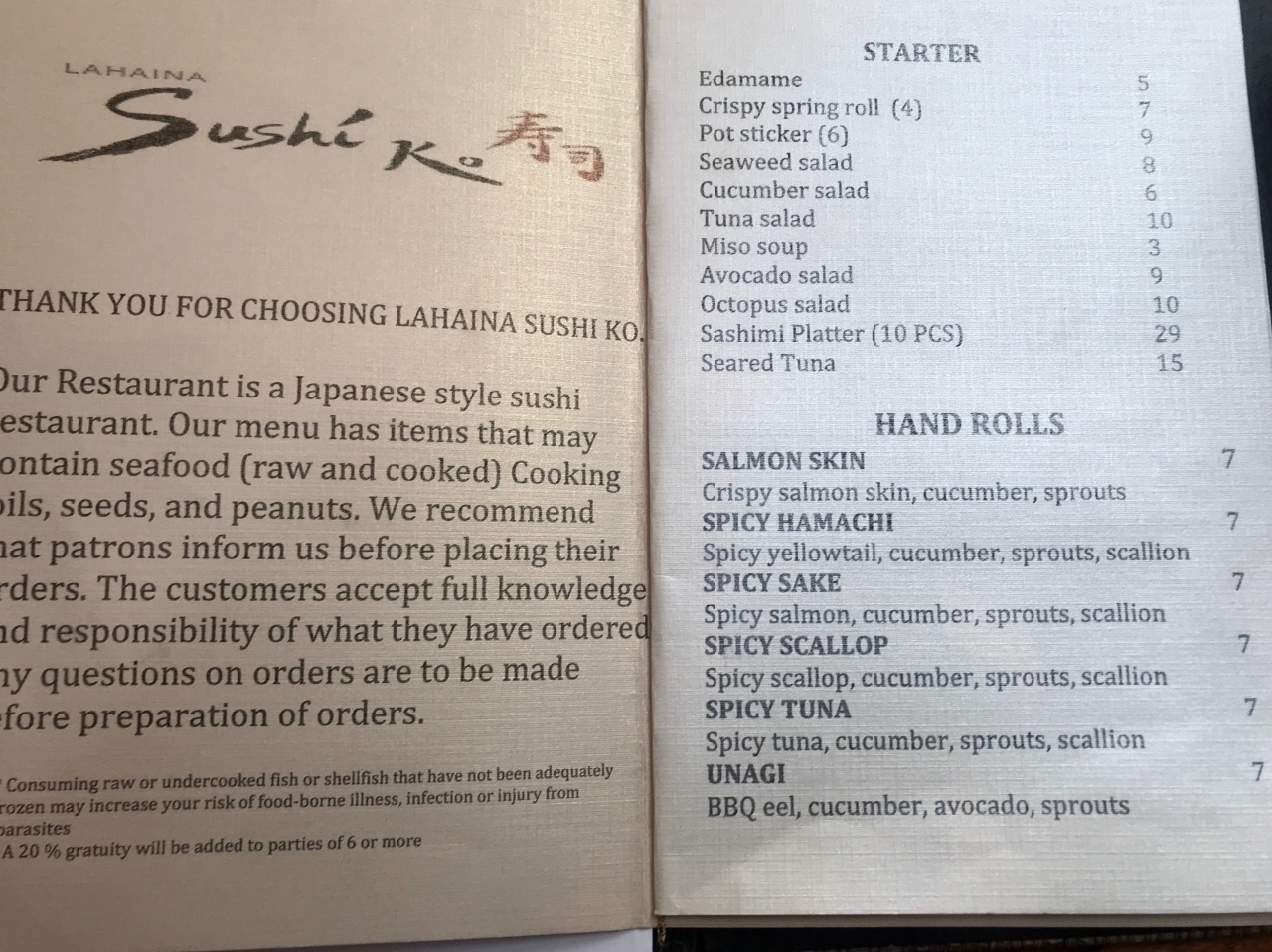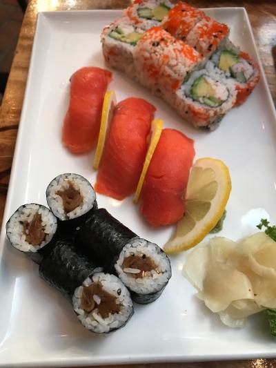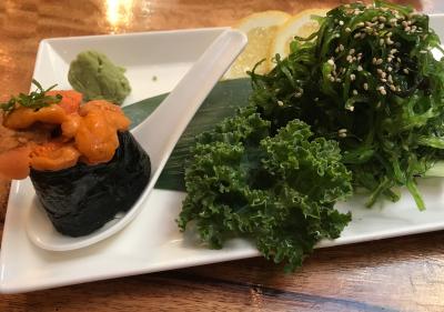 ワカメサラダ(8$)、ウニ(2p=18)、カメフォルニアロール(8P=10$)、うなぎ(3P=10)、干瓢巻き(6P=6)、スモークサーモン(3p=10)で、トータル75$でした
