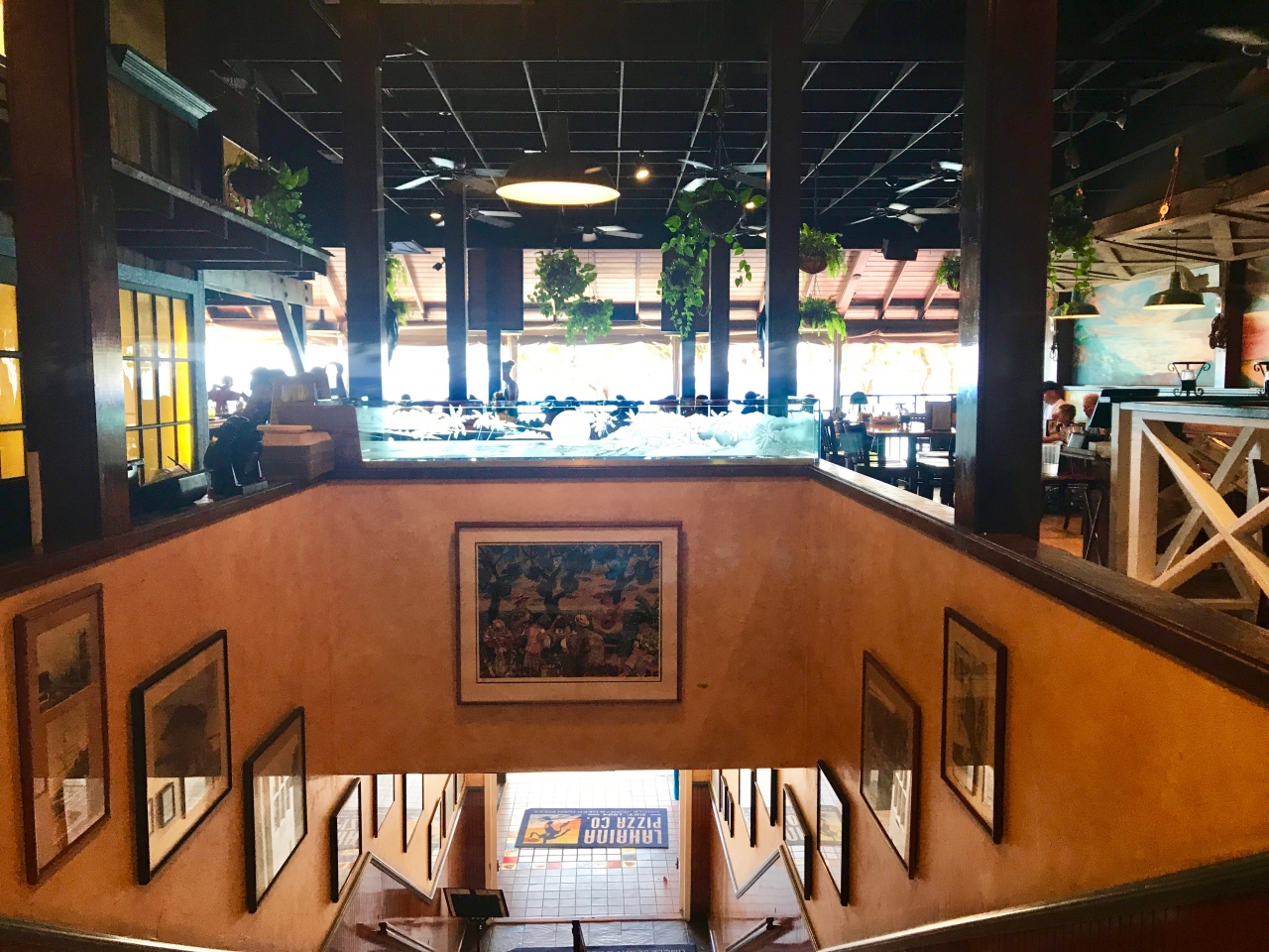 フロントストリートの海側にお店がなくなるあたりの2階にあり、窓側からは海も一部見える席があります