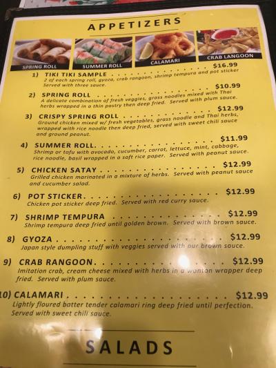 TIKI TIKI SAMPLE (16.99$)は、春巻き、揚げ餃子、エビ天など色々楽しめて良いです