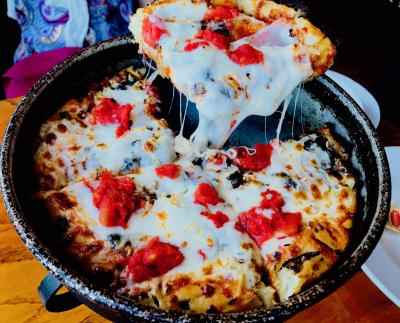 ピザはシカゴ発祥のディープフィッシュ・ピザと呼ばれるもので、生地が深い皿のごとく暑くてボリュウムがあり、焼いた鍋ごと持ってきてテーブル上のスタンドの上に乗せて切り分けてくれます