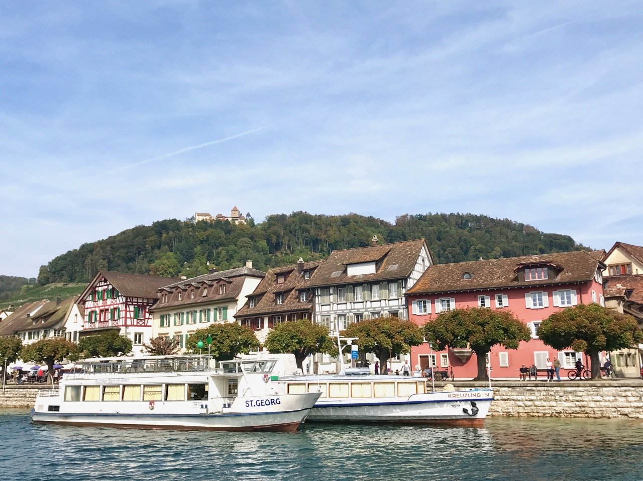 「ラインの宝石」と呼ばれ中世の街並みの雰囲気が色濃く残るシュタイン・アム・ラインの中心的場所で、ホテルの前などには沢山のテラス席が並んでいて、多くの人で賑わいます